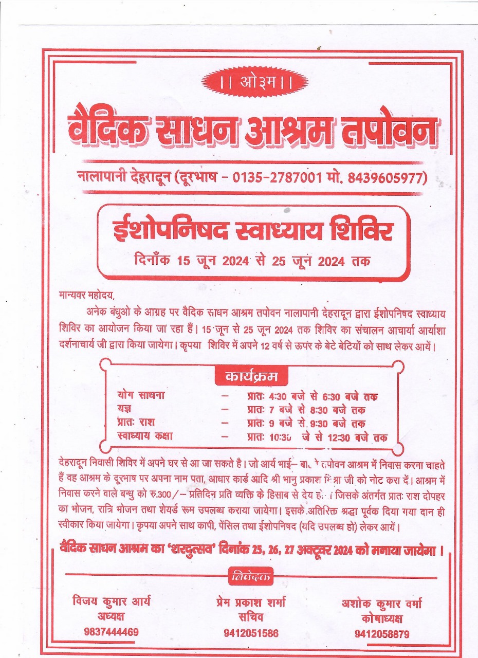अनेक बंधुओ के आग्रह पर वैदिक साधन आश्रम तपोवन नालापानी देहरादून द्वारा ईशोपनिषद स्वाध्याय शिविर का आयोजन किया जा रहा हैं। 15 जून से 25 जून 2024 तक शिविर का संचालन आचार्या आर्याशा दर्शनाचार्य जी द्वारा किया जायेगा। कृपया शिविर में अपने 12 वर्ष से ऊपर के बेटे बेटियों को साथ लेकर आयें।