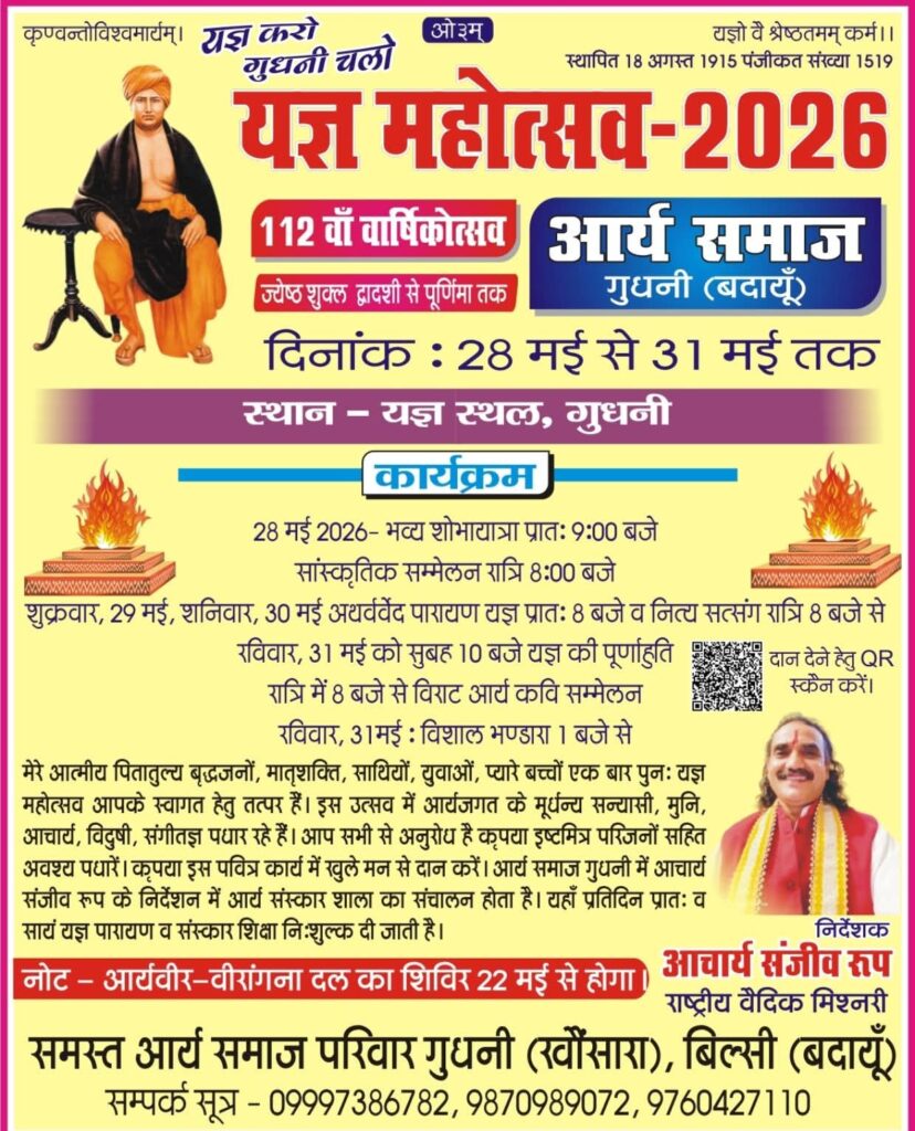 वैदिक परंपरा, यज्ञीय संस्कृति और आध्यात्मिक जागरण की पावन धारा को जन-जन तक पहुँचाने के उद्देश्य से आर्य समाज गुधनी (बदायूँ), उत्तर प्रदेश द्वारा 112वाँ वार्षिकोत्सव एवं यज्ञ महोत्सव-2026 का भव्य आयोजन किया जा रहा है। यह महोत्सव 28 मई से 31 मई 2026 तक यज्ञ स्थल, गुधनी में संपन्न होगा।