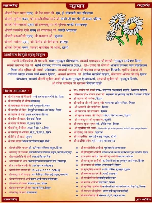 स्वामी आदित्यवेश जी सरस्वती, प्रधान गुरुकुल धीरणवास, आचार्य रामस्वरूप जी शास्त्री गुरुकुल आर्यनगर हिसार स्वामी रामानन्द वेश जी महर्षि दयानन्द योगधाम सुकरताल (उ.प्र.), डॉ० प्रमोद जी योगार्थी आचार्य दयानन्द ब्रह्म महाद्यिालय हिसार डॉ० सुमित्रा जी आर्या फतेहाबाद, आचार्या दया आर्या जी पंचगांव कन्या गुरूकुल भिवानी, सूर्यदेव वेदान्णु जी. धर्माचार्य मॉडल टाऊन आर्य समाज हिसार, आचार्य सत्यवान जी डिफैन्स कालोनी हिसार, योगाचार्य अनिल जी पान हिसार योगशाला, प्राचार्य श्रीमती सुनीता आर्या जी कन्या गुरुकुल ऐन्बराकलां, आचार्या सुनीता जी गुरुकुल घिराये, श्री रमेश ऋषिदेव जी गुरुकुल शेखपुरा हांसी