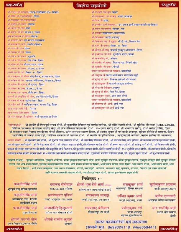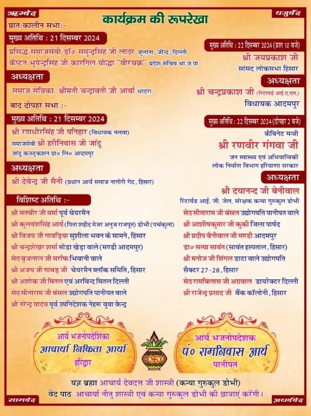 यज्ञ ब्रह्मा आचार्य देवदत्त जी शास्त्री (कन्या गुरुकुल डोभी) वेद पाठ आचार्या नीतु शास्त्री एवं कन्या गुरुकुल डोभी की छात्राएं करेंगी।