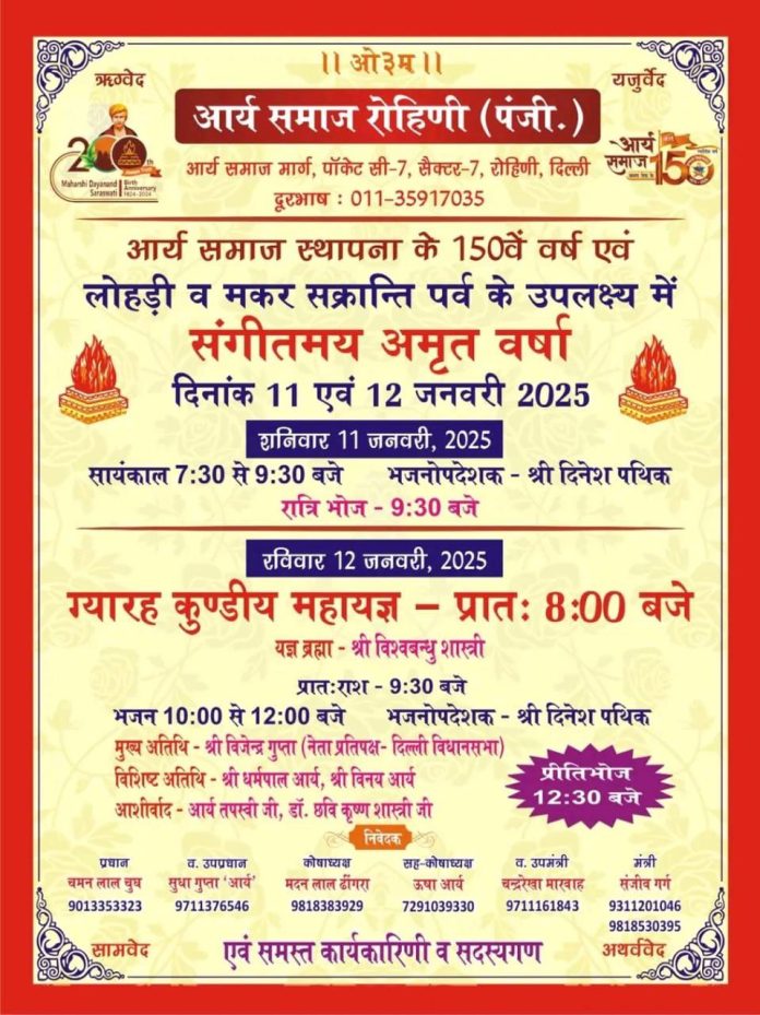 आर्य समाज स्थापना के 150वें वर्ष एवं लोहड़ी व मकर सक्रान्ति पर्व के उपलक्ष्य में संगीतमय अमृत वर्षा दिनांक 11 एवं 12 जनवरी 2025