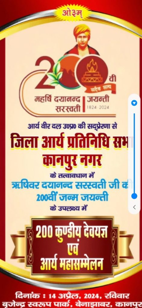 आर्य वीर दल उ०प्र० की सदप्रेरणा से जिला आर्य प्रतिनिधि सभ कानपुर नगर के तत्वावधान में ऋषिवर दयानन्द सरस्वती जी के 200वीं जन्म जयन्ती के उपलक्ष्य में