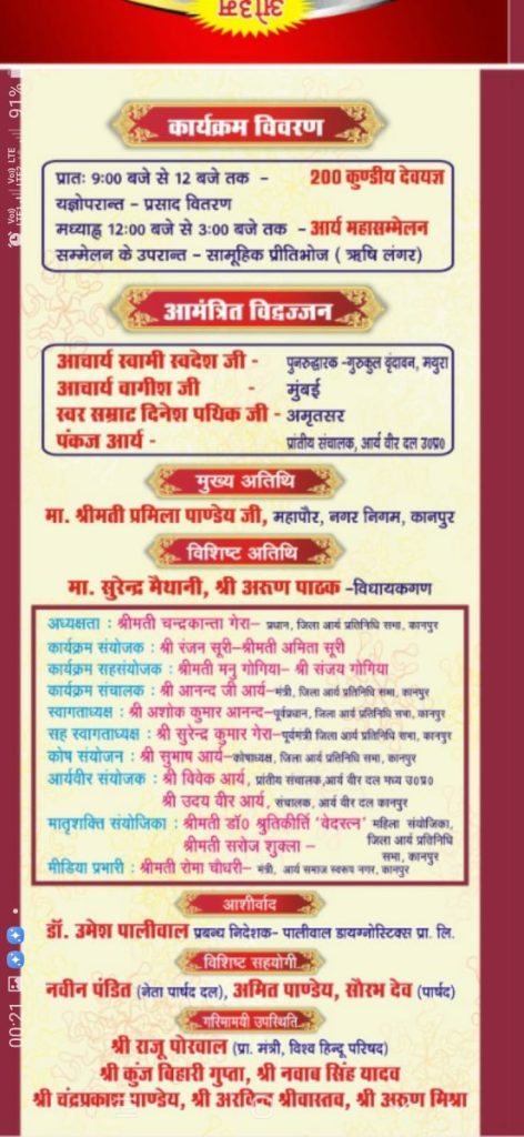 सह स्वागताध्यक्ष : श्री सुरेन्द्र कुमार गेरा पूर्वमंत्री जिला आर्य प्रतिनिधि सभा , कानपुर