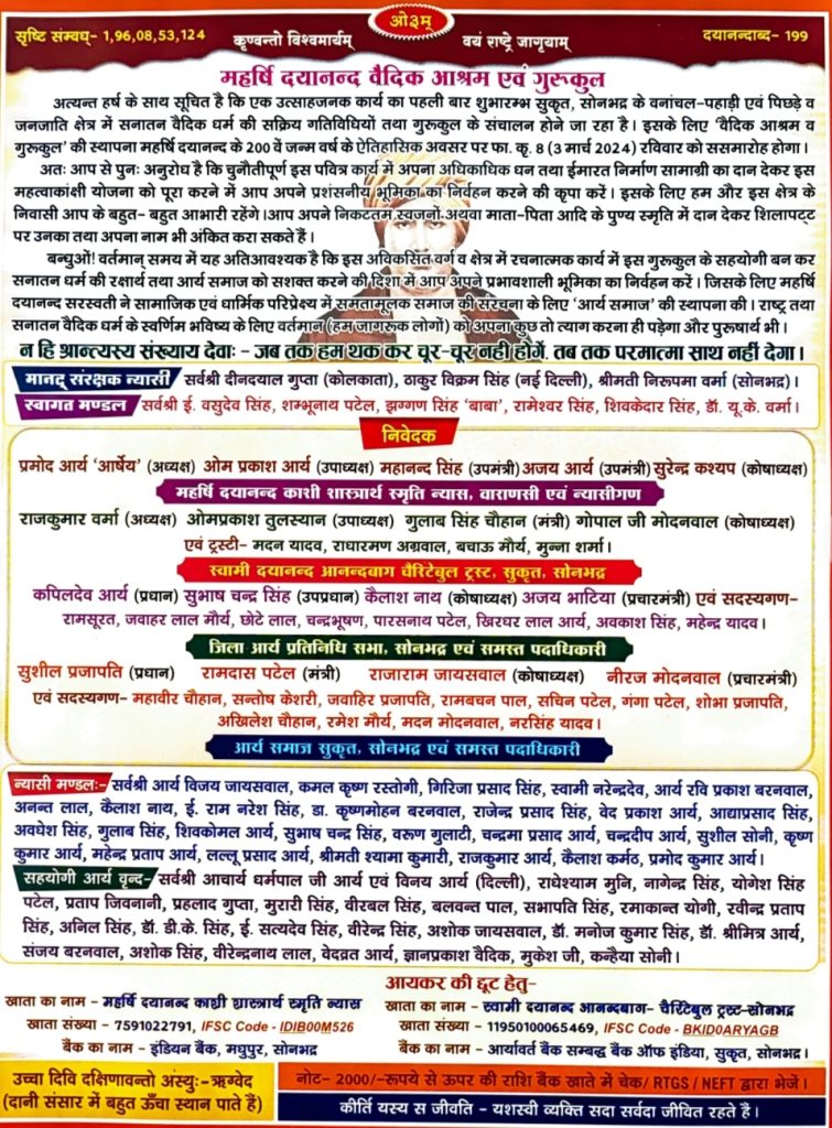 का नाम स्वामी दयानन्द आनन्दबाज चैरिटेबल ट्रस्ट-सोनभद्र खाता संख्या 11950100065469, IFSC Code-BKID0ARYAGB