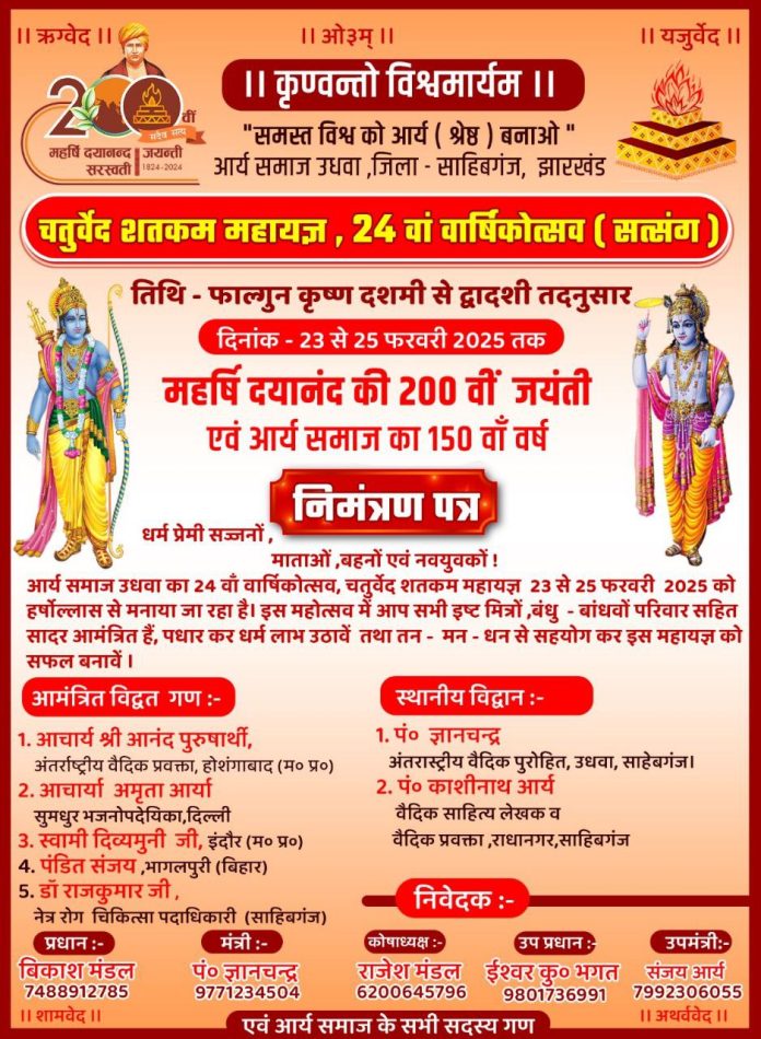 आर्य समाज उधवा का 24 वाँ वार्षिकोत्सव, चतुर्वेद शतकम महायज्ञ 23 से 25 फरवरी 2025 को हर्षोल्लास से मनाया जा रहा है। इस महोत्सव में आप सभी इष्ट मित्रों, बंधु – बांधवों परिवार सहित सादर आमंत्रित हैं, पधार कर धर्म लाभ उठावें तथा तन मन धन से सहयोग कर इस महायज्ञ को सफल बनावें ।