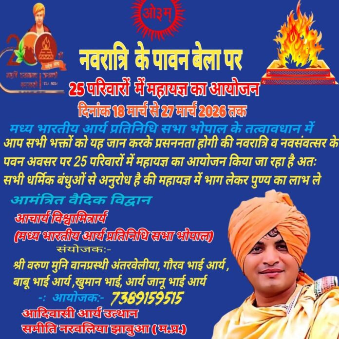 मध्य भारतीय आर्य प्रतिनिधि सभा, भोपाल के तत्वावधान में यह बताते हुए हर्ष का अनुभव हो रहा है कि नवरात्रि एवं नवसंवत्सर के पावन अवसर पर 25 परिवारों में भव्य महायज्ञ का आयोजन किया जा रहा है।