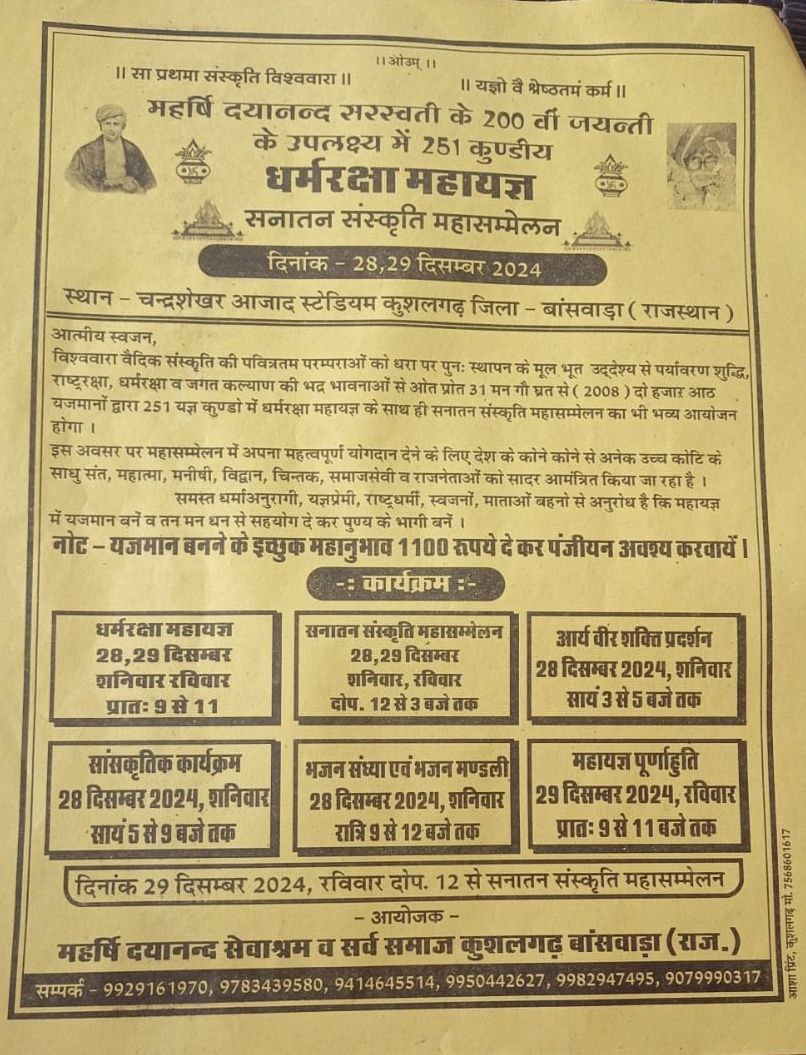 आयोजक – महर्षि दयानन्द सेवाश्रम व सर्व समाज कुशलगढ़ बांसवाड़ा (राज.)