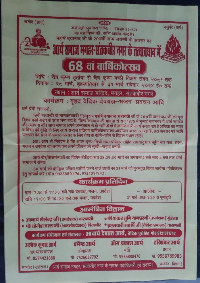महर्षि दयानन्द जी के 200वीं जन्म जयन्ती के अवसर पर आर्य समाज मगहर-संतकबीर नगर के तत्वावधान में68 वां वार्षिकोत्सव।