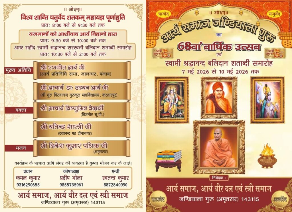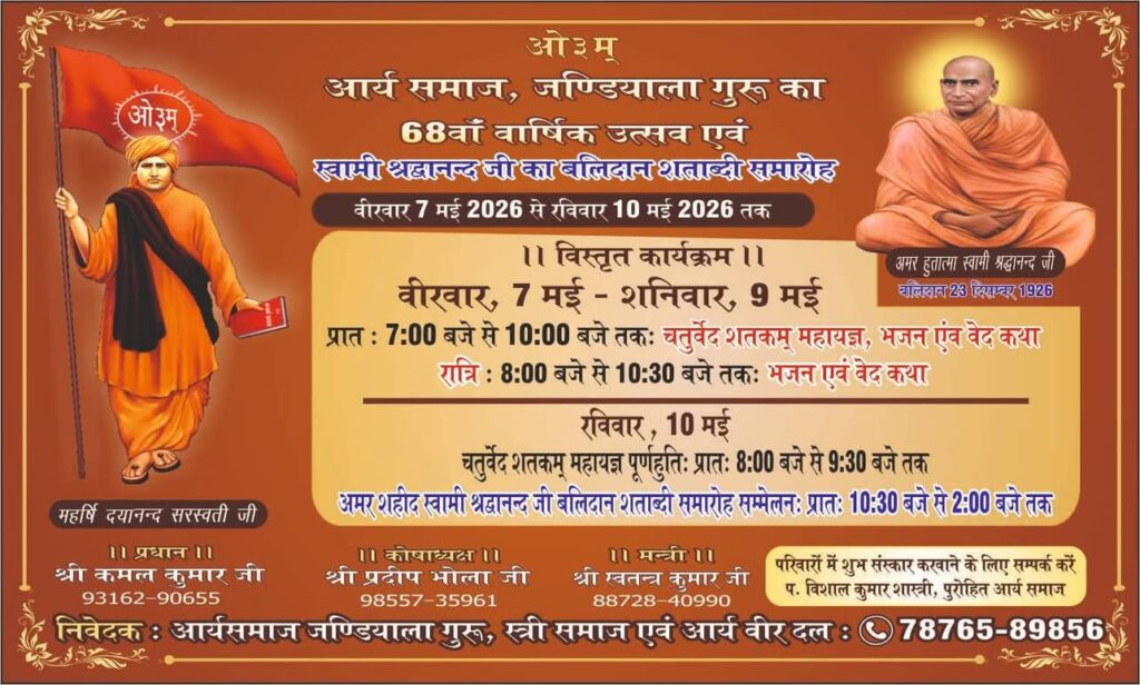 आर्य समाज जंडियाला गुरु द्वारा अत्यंत श्रद्धा, उत्साह और वैदिक परंपरा के साथ 68वाँ वार्षिक उत्सव तथा अमर हुतात्मा स्वामी श्रद्धानंद सरस्वती जी के बलिदान के 100 वर्ष पूर्ण होने पर बलिदान शताब्दी समारोह का भव्य आयोजन किया जा रहा है। यह पावन कार्यक्रम वीरवार 7 मई 2026 से रविवार 10 मई 2026 तक आयोजित होगा।