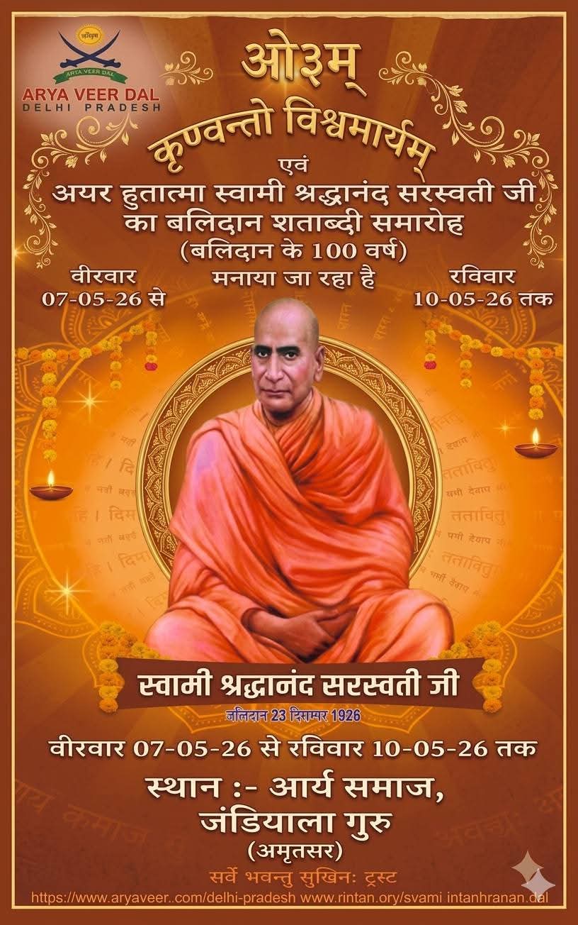 आर्य समाज जंडियाला गुरु द्वारा अत्यंत श्रद्धा, उत्साह और वैदिक परंपरा के साथ 68वाँ वार्षिक उत्सव तथा अमर हुतात्मा स्वामी श्रद्धानंद सरस्वती जी के बलिदान के 100 वर्ष पूर्ण होने पर बलिदान शताब्दी समारोह का भव्य आयोजन किया जा रहा है। यह पावन कार्यक्रम वीरवार 7 मई 2026 से रविवार 10 मई 2026 तक आयोजित होगा।