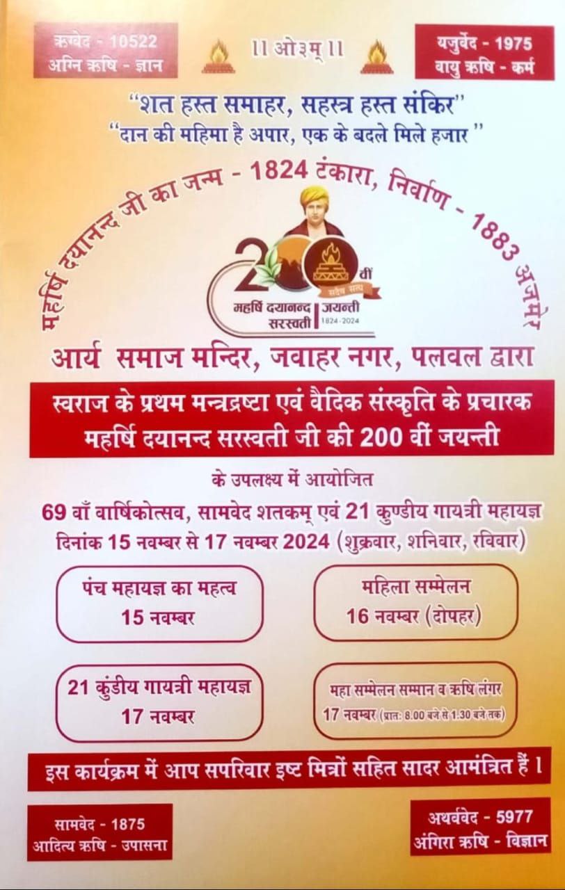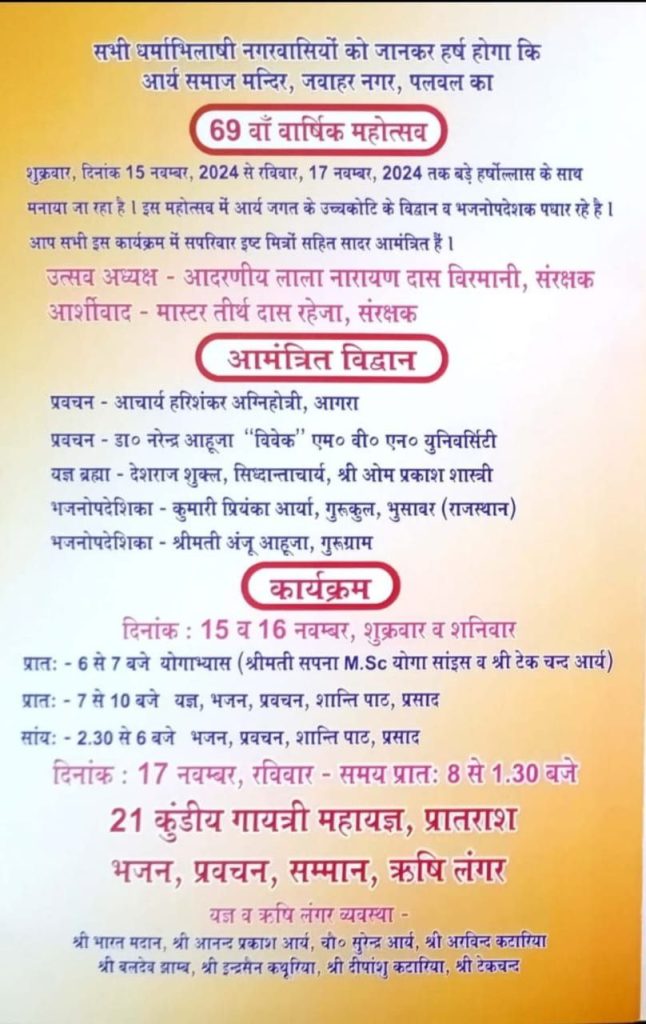 सभी धर्माभिलाषी नगरवासियों को जानकर हर्ष होगा कि आर्य समाज मन्दिर, जवाहर नगर, पलवल का