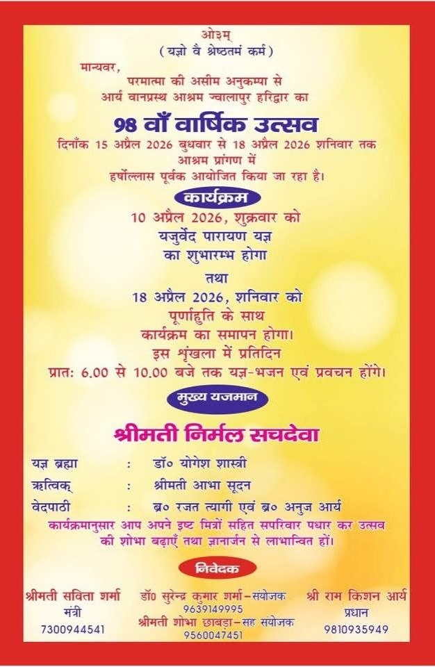 परमात्मा की असीम अनुकम्पा से आर्य वानप्रस्थ आश्रम ज्वालापुर हरिद्वार का 98 वाँ वार्षिक उत्सव दिनाँक 15 अप्रैल 2026 बुधवार से 18 अप्रैल 2026 शनिवार तक आश्रम प्रांगण में हर्षोल्लास पूर्वक आयोजित किया जा रहा है।