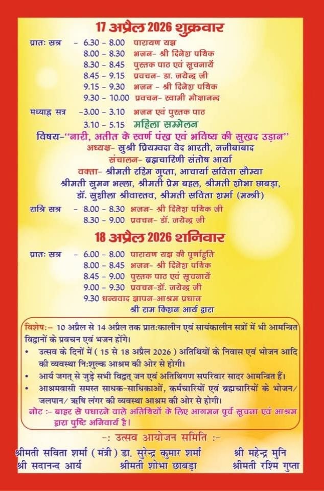 - 10 अप्रैल से 14 अप्रैल तक प्रातःकालीन एवं सायंकालीन सत्रों में भी आमन्त्रित विद्वानों के प्रवचन एवं भजन होंगे।