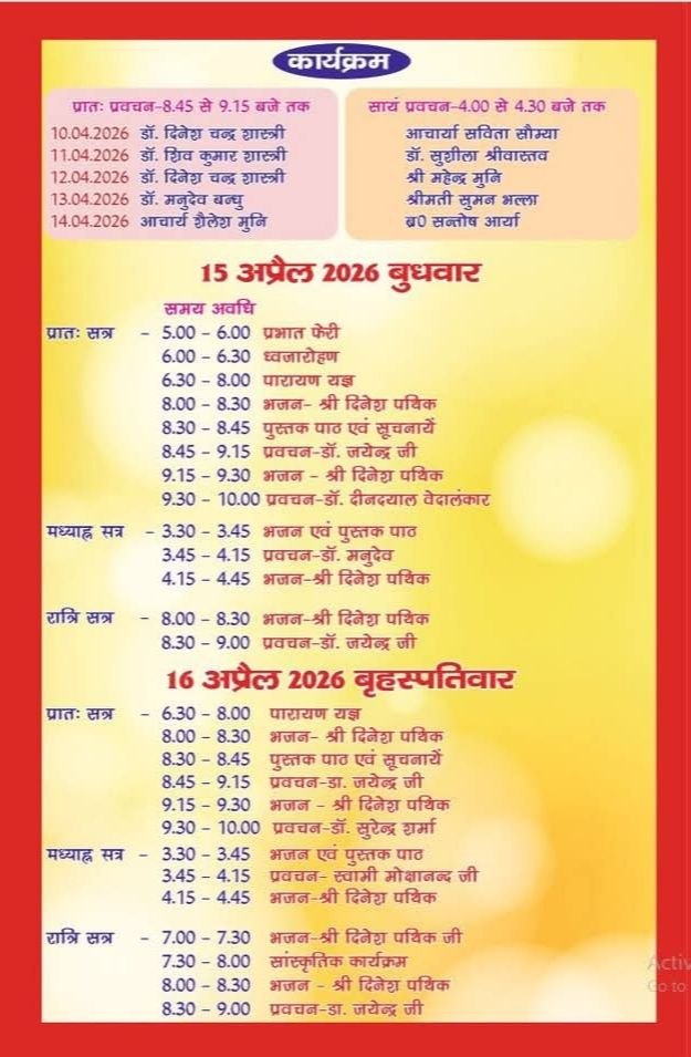 10 अप्रैल 2026, शुक्रवार को यजुर्वेद पारायण यज्ञ का शुभारम्भ होगा तथा 18 अप्रैल 2026, शनिवार को पूर्णाहुति के साथ कार्यक्रम का समापन होगा। इस श्रृंखला में प्रतिदिन प्रातः 6.00 से 10.00 बजे तक यज्ञ-भजन एवं प्रवचन होंगे।