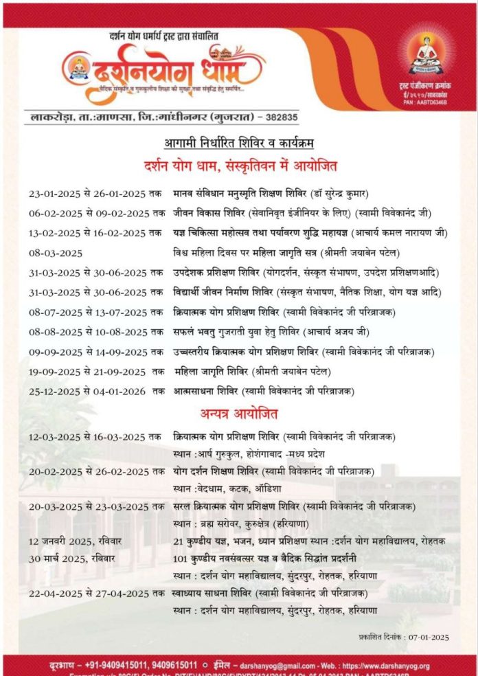 20-03-2025 से 23-03-2025 तक – सरल क्रियात्मक योग प्रशिक्षण शिविर (स्वामी विवेकानंद जी परिव्राजक) स्थान : ब्रह्म सरोवर, कुरुक्षेत्र (हरियाणा)