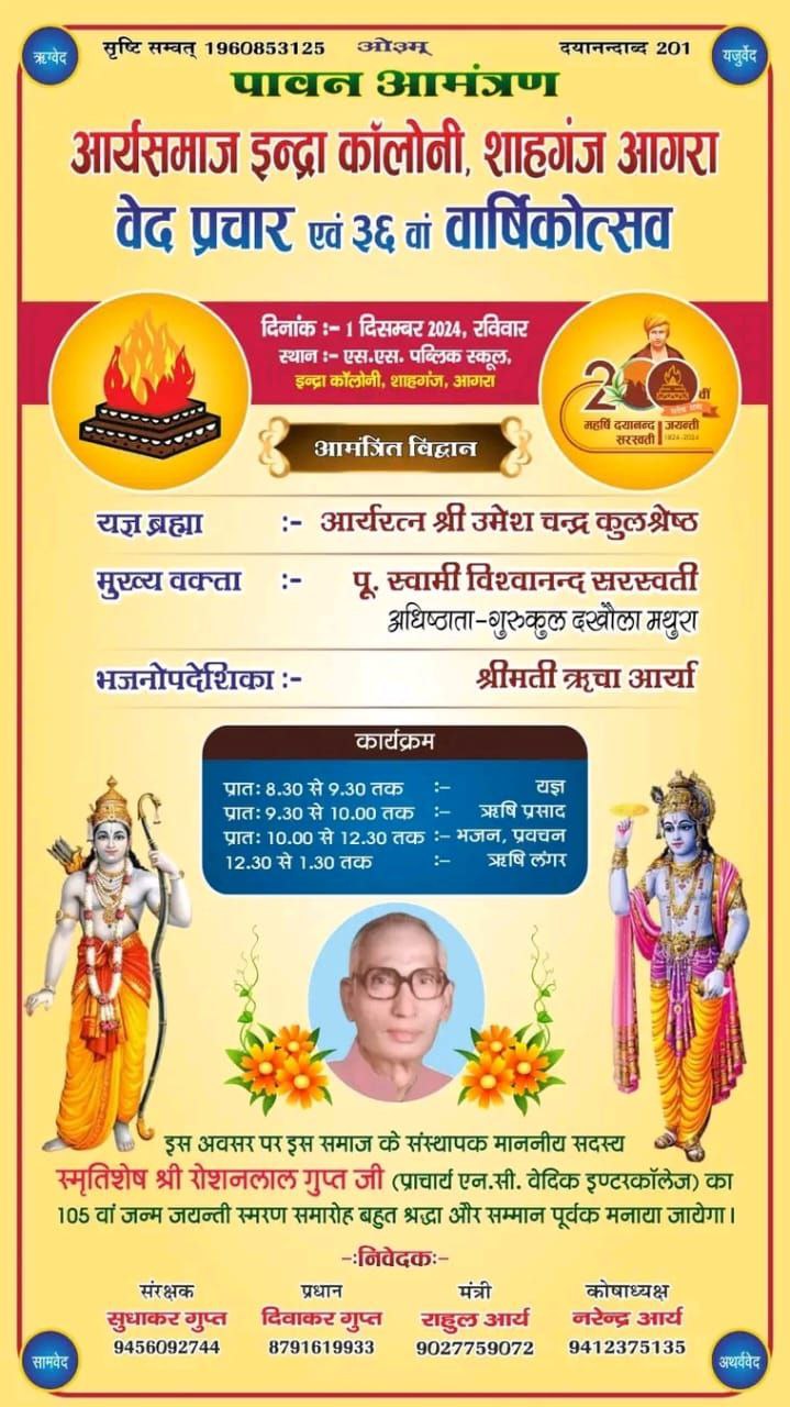 आर्यसमाज इन्द्रा कॉलोनी, शाहगंज आगरा वेद प्रचार एवं ३६वां वार्षिकोत्सव