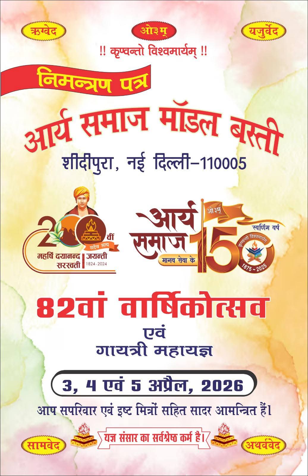 नई दिल्ली के शहीदपुरा स्थित आर्य समाज मॉडल बस्ती में आर्य समाज के 150वें स्वर्णिम स्थापना वर्ष तथा महर्षि दयानन्द सरस्वती जी की 200वीं जयंती के पावन अवसर पर 82वाँ वार्षिकोत्सव एवं गायत्री महायज्ञ अत्यंत श्रद्धा, उत्साह और वैदिक गरिमा के साथ आयोजित किया जा रहा है। यह भव्य आयोजन 3, 4 एवं 5 अप्रैल 2026 को संपन्न होगा, जिसमें धर्मप्रेमी श्रद्धालुओं, आर्य बंधुओं एवं क्षेत्रवासियों के लिए विशेष धार्मिक और सांस्कृतिक कार्यक्रमों की श्रृंखला रखी गई है।