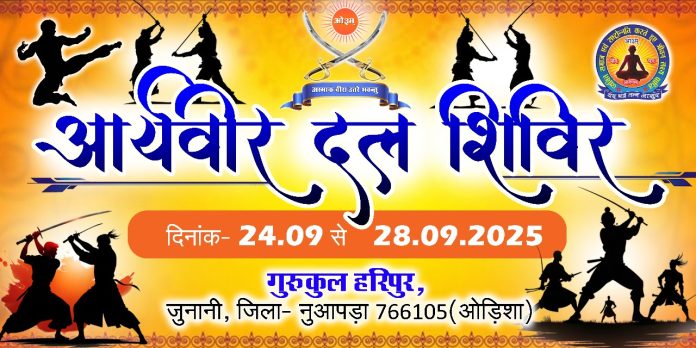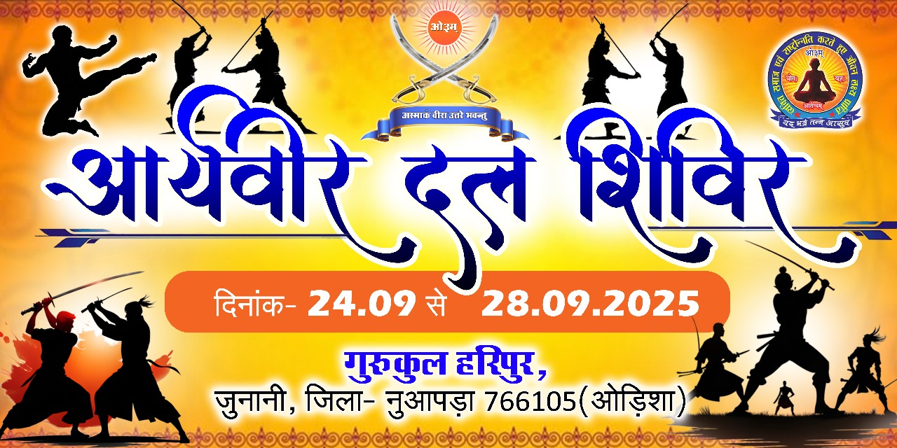 गुरुकुल हरिपुर, जुनानी, पो.-गोड़फूला, जिला- नुआपड़ा (ओड़िशा) में आर्यवीर दल का विशेष शिविर आयोजित किया जा रहा है। यह शिविर दिनांक 24 सितम्बर से 28 सितम्बर तक चलेगा। इस अवसर पर हमारे साथ आचार्य चाँदसिंह योगी जी ( हरयाणा ) रहेंगे, जो प्रतिभागियों को मार्गदर्शन एवं प्रशिक्षण प्रदान करेंगे।