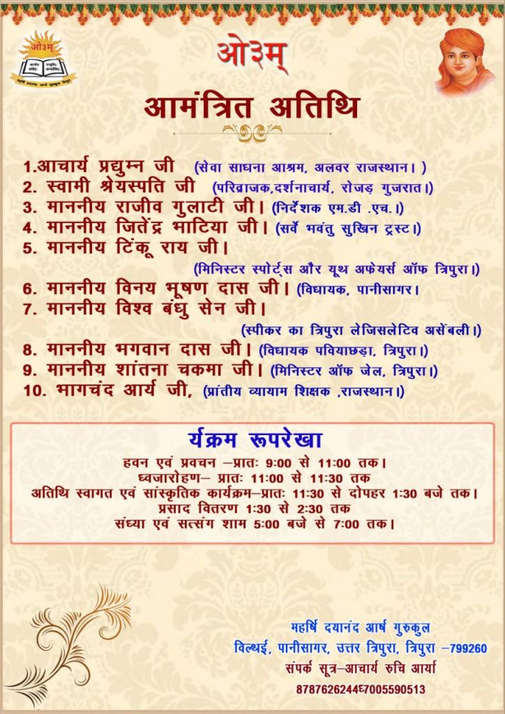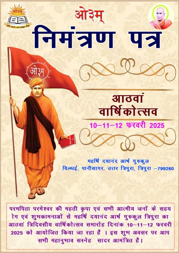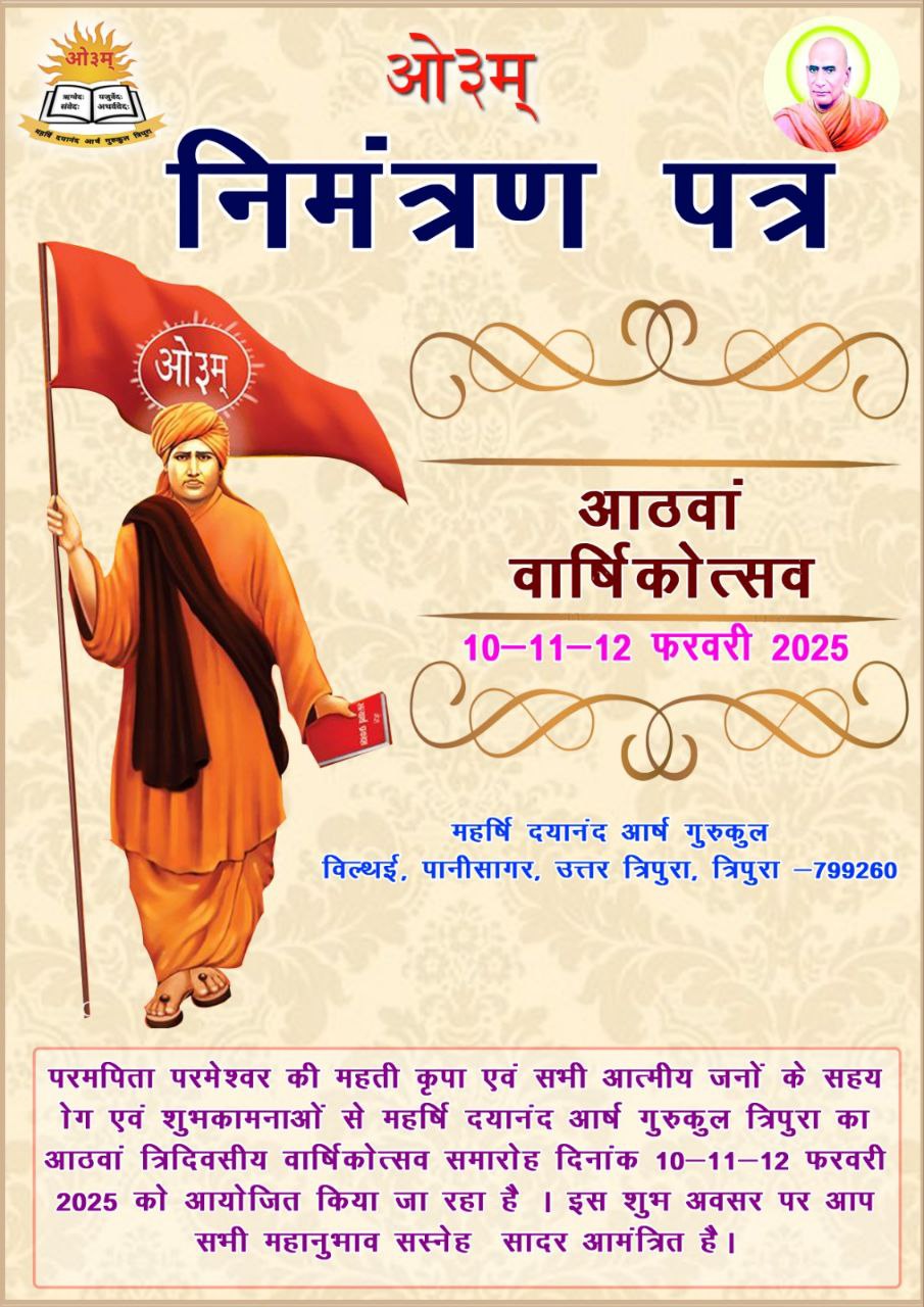 परमपिता परमेश्वर की महती कृपा एवं सभी आत्मीय जनों के सहय ोग एवं शुभकामनाओं से महर्षि दयानंद आर्ष गुरुकुल त्रिपुरा का आठवां त्रिदिवसीय वार्षिकोत्सव समारोह दिनांक 10-11-12 फरवरी 2025 को आयोजित किया जा रहा है । इस शुभ अवसर पर आप सभी महानुभाव सस्नेह सादर आमंत्रित है।