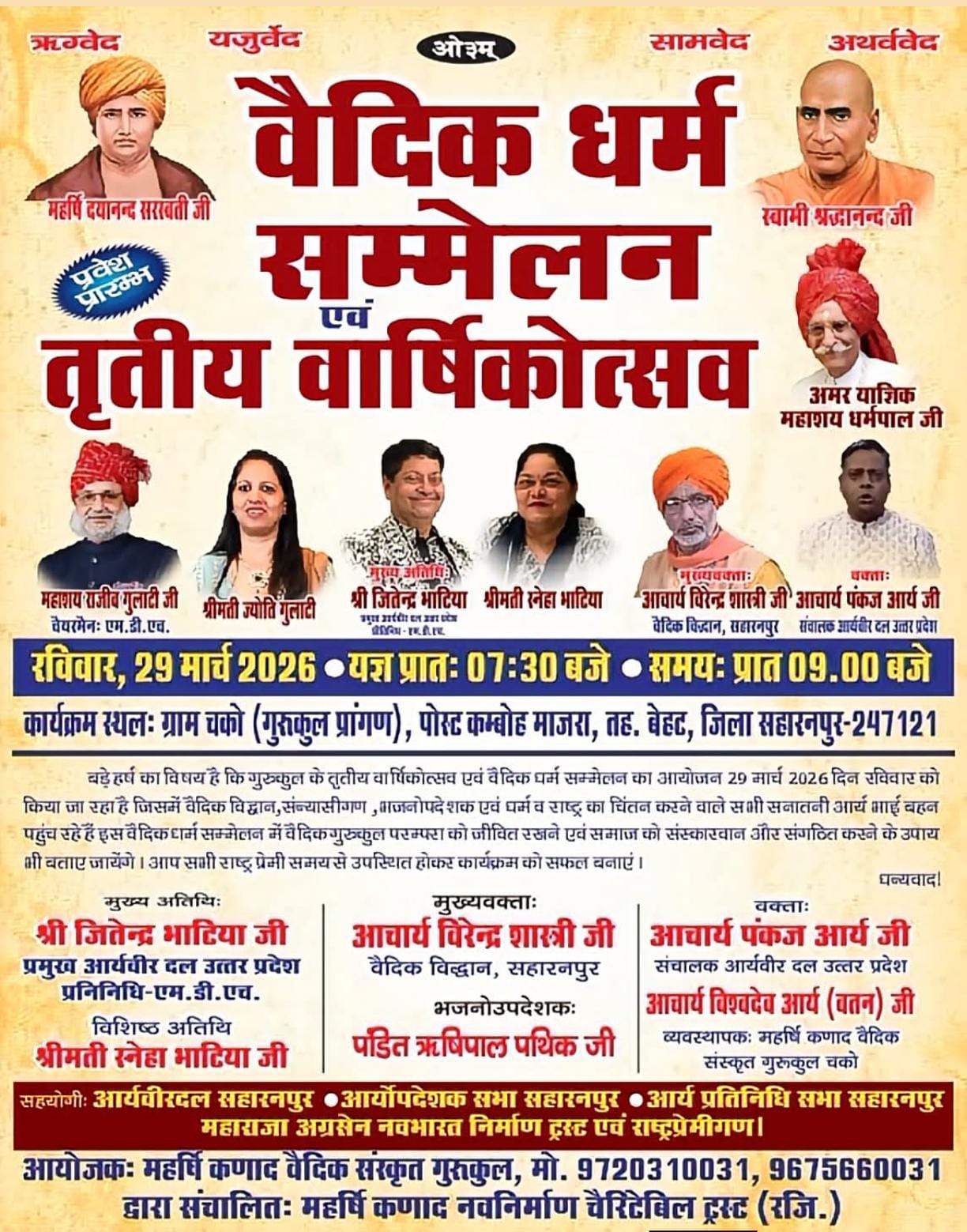 • कार्यक्रम स्थल: ग्राम चको (गुरुकुल प्रांगण), पोस्ट कम्बोह माजरा, तहसील बेहट, जिला सहारनपुर – 247121
