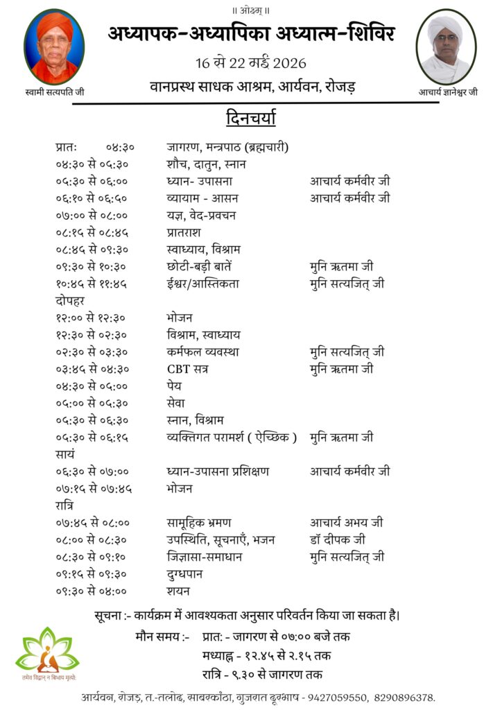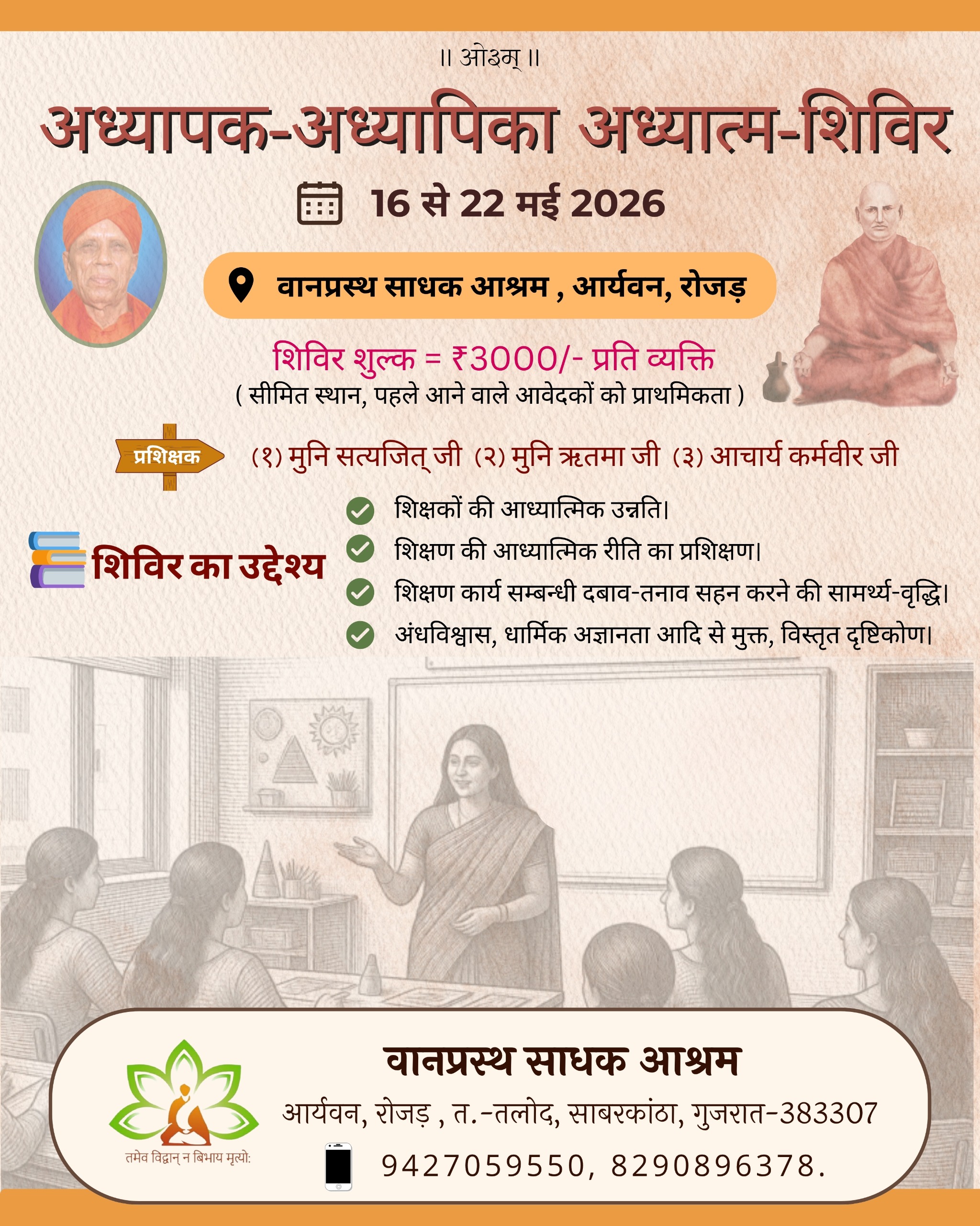 वानप्रस्थ साधक आश्रम, आर्यवन, रोजड़ में 16 से 22 मई 2026 तक “अध्यापक-अध्यापिका अध्यात्म-शिविर” का भव्य आयोजन किया जा रहा है। यह शिविर विशेष रूप से शिक्षकों एवं शिक्षिकाओं के लिए आयोजित किया गया है, जिसका उद्देश्य उनके आध्यात्मिक, मानसिक, नैतिक एवं व्यावसायिक विकास को सशक्त बनाना है।
