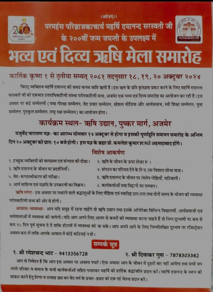 ऋषि लंगर- इस अवसर पर पधारने वाले श्रद्धालुओं के लिए पौष्टिक एवं स्वादिष्ट प्रातः राश तथा दोनों समय के भोजन की व्यवस्था परोपकारिणी सभा की ओर से होगी।