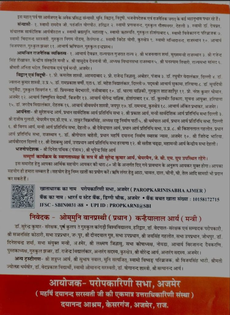 आमन्त्रित राजनैतिक व्यक्तित्व – १. आचार्य देवव्रत, राज्यपाल गुजरात राज्य २. श्री भजनलाल शर्मा, मुख्यमन्त्री राजस्थान ३. श्री गजेन्द्र सिंह शेखावत, केन्द्रीय संस्कृति मन्त्री ४. श्री वासुदेव देवनानी जी, अध्यक्ष विधानसभा राजस्थान ५. श्री घनश्याम तिवारी, राज्यसभा सांसद ६. श्रीमती अनिता भदेल, विधायक एवं पूर्व मन्त्री, अजमेर।