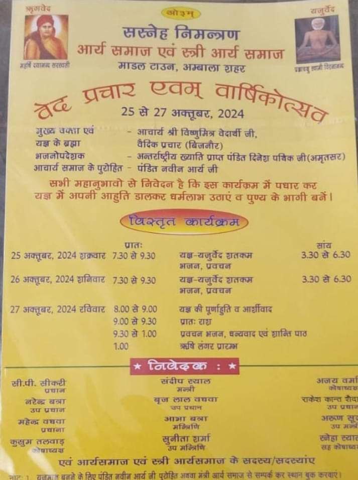 सभी महानुभावो से निवेदन है कि इस कार्यक्रम में पधार कर यज्ञ में अपनी आहुति डालकर धर्मलाभ उठाएं व पुण्य के भागी बनें।