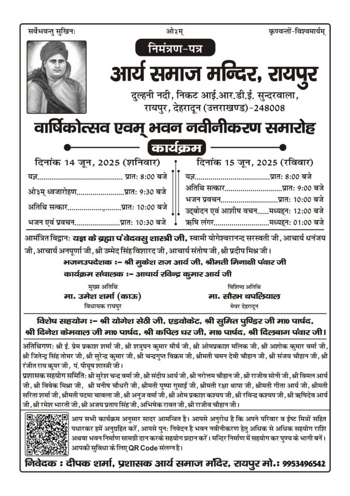 आर्य समाज मंदिर, रायपुर (दुल्हनी नदी, निकट आई.आर.डी.ई. सुन्दरवाला, देहरादून) में आगामी 14 एवं 15 जून 2025 को वार्षिकोत्सव एवम् भवन नवीनीकरण समारोह का भव्य आयोजन किया जा रहा है। यह कार्यक्रम दो दिवसीय धार्मिक, सांस्कृतिक एवं सामाजिक समर्पण का प्रतीक होगा, जिसमें अनेक श्रद्धालु, विद्वान एवं विशिष्टजन भाग लेंगे।