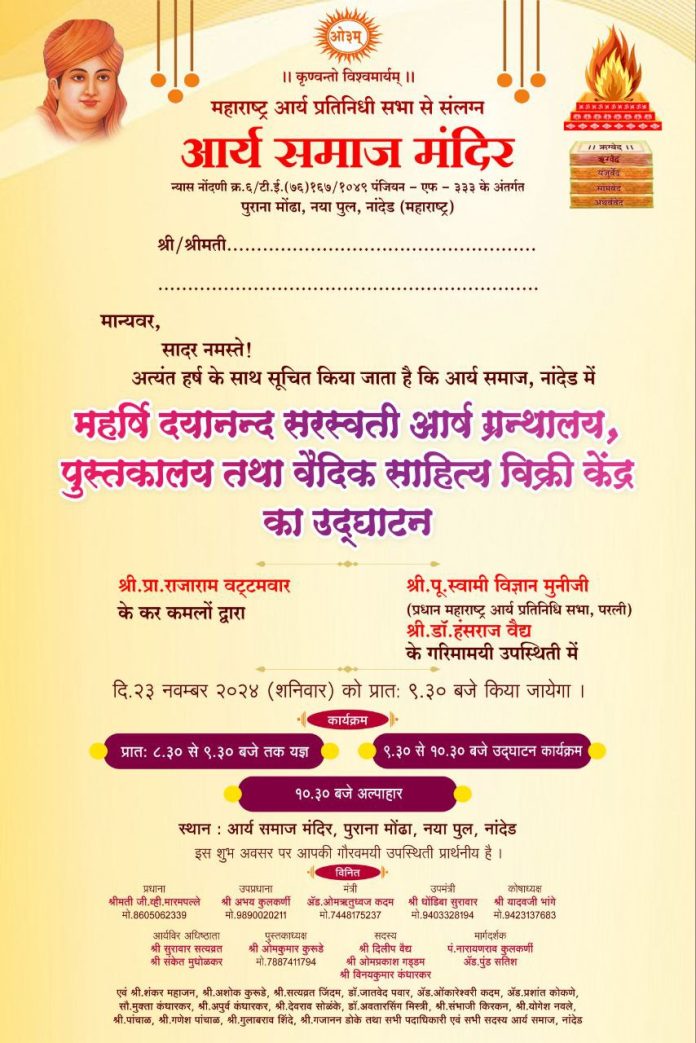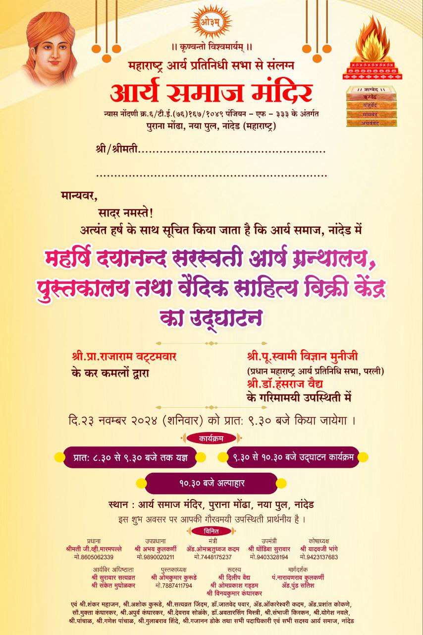 स्थान : आर्य समाज मंदिर, पुराना मोंढा, नया पुल, नांदेड इस शुभ अवसर पर आपकी गौरवमयी उपस्थिती प्रार्थनीय है।
