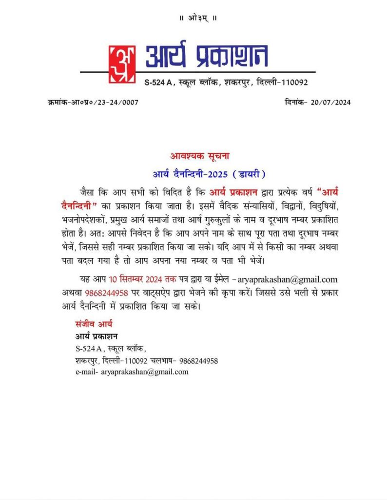 आर्य दैनन्दिनी-2025 (डायरी) जैसा कि आप सभी को विदित है कि आर्य प्रकाशन द्वारा प्रत्येक वर्ष “आर्य दैनन्दिनी” का प्रकाशन किया जाता है। इसमें वैदिक संन्यासियों, विद्वानों, विदुषियों, भजनोपदेशकों, प्रमुख आर्य समाजों तथा आर्ष गुरुकुलों के नाम व दूरभाष नम्बर प्रकाशित होता है। अतः आपसे निवेदन है कि आप अपने नाम के साथ पूरा पता तथा दूरभाष नम्बर भेजें, जिससे सही नम्बर प्रकाशित किया जा सके।