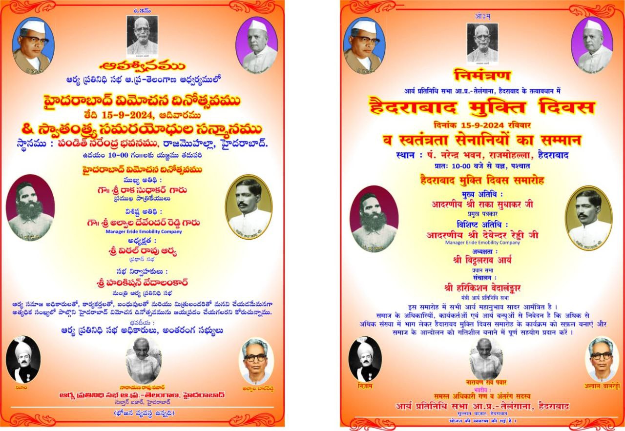 इस समारोह में सभी आर्य महानुभाव सादर आमंत्रित है। समाज के अधिकारियों, कार्यकर्ताओं एवं आर्य बन्धुओं से निवेदन है कि अधिक से अधिक संख्या में भाग लेकर हिदाराबद मुक्ति दिवस समारोह के कार्यक्रम को सफल बनाएं और समाज के आन्दोलन को गतिशील बनाने में पूर्ण सहयोग प्रदान करें।