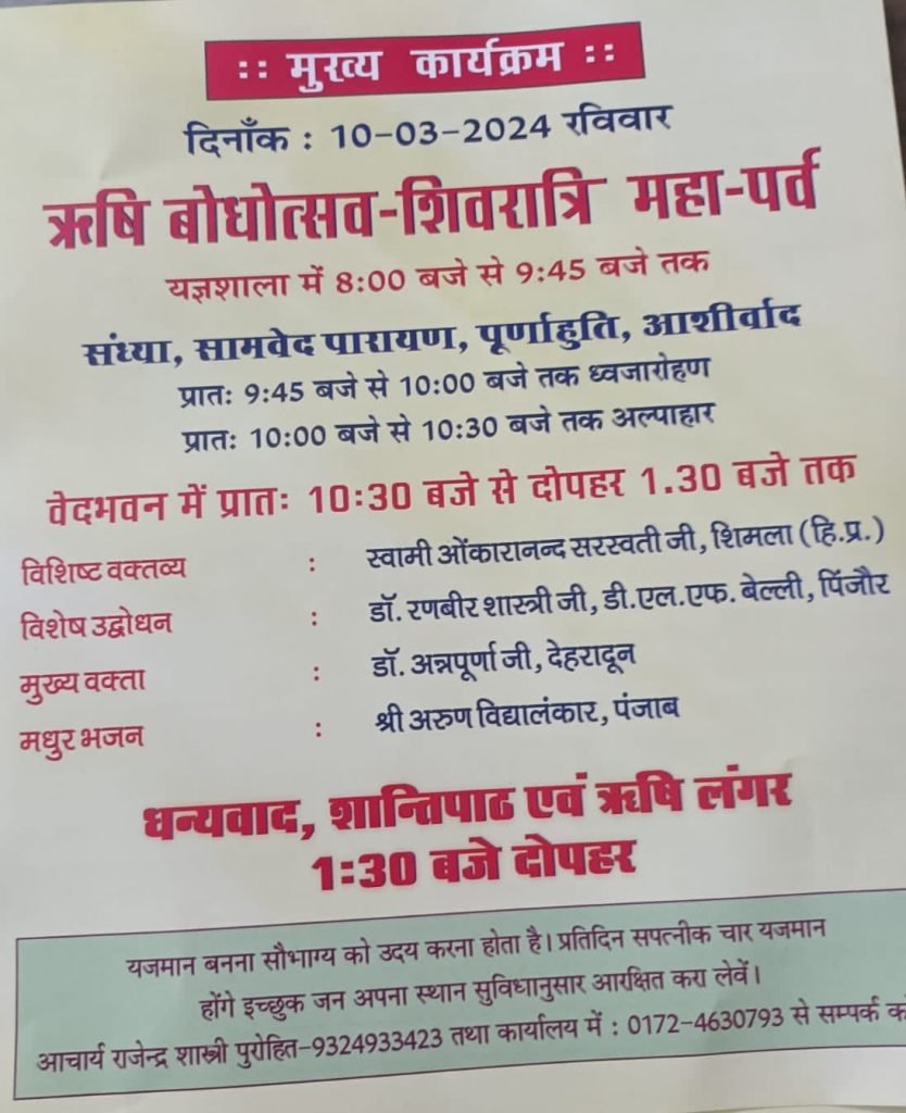 अतः आप सभी से विनम्र निवेदन है कि इस कार्यक्रम में भाग लेकर धर्म लाभ प्राप्त करें और आर्य समाज की शोमा बढ़ाएं।
