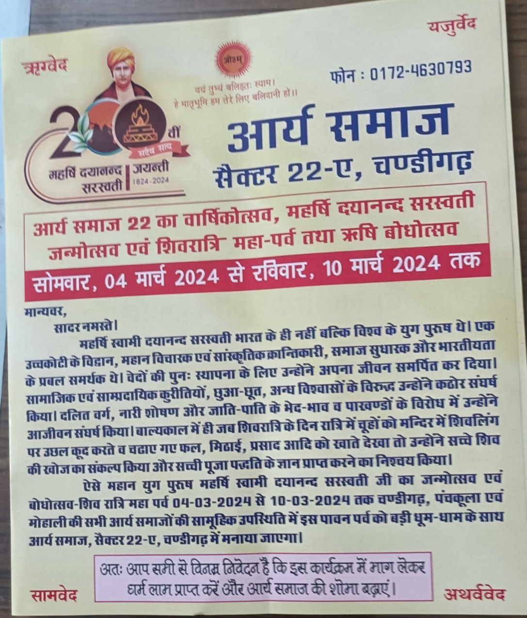 ऐसे महान युग पुरुष महर्षि स्वामी दयानन्द सरस्वती जी का जन्मोत्सव एवं बोधोत्सव-शिव रात्रि महा पर्व 04-03-2024 से 10-03-2024 तक चण्डीगढ़, पंचकूला एवं मोहाली की सभी आर्य समाजों की सामूहिक उपस्थिति में इस पावन पर्व को बड़ी धूम-धाम के साथ आर्य समाज, सैक्टर 22-ए, चण्डीगढ़ में मनाया जाएगा।