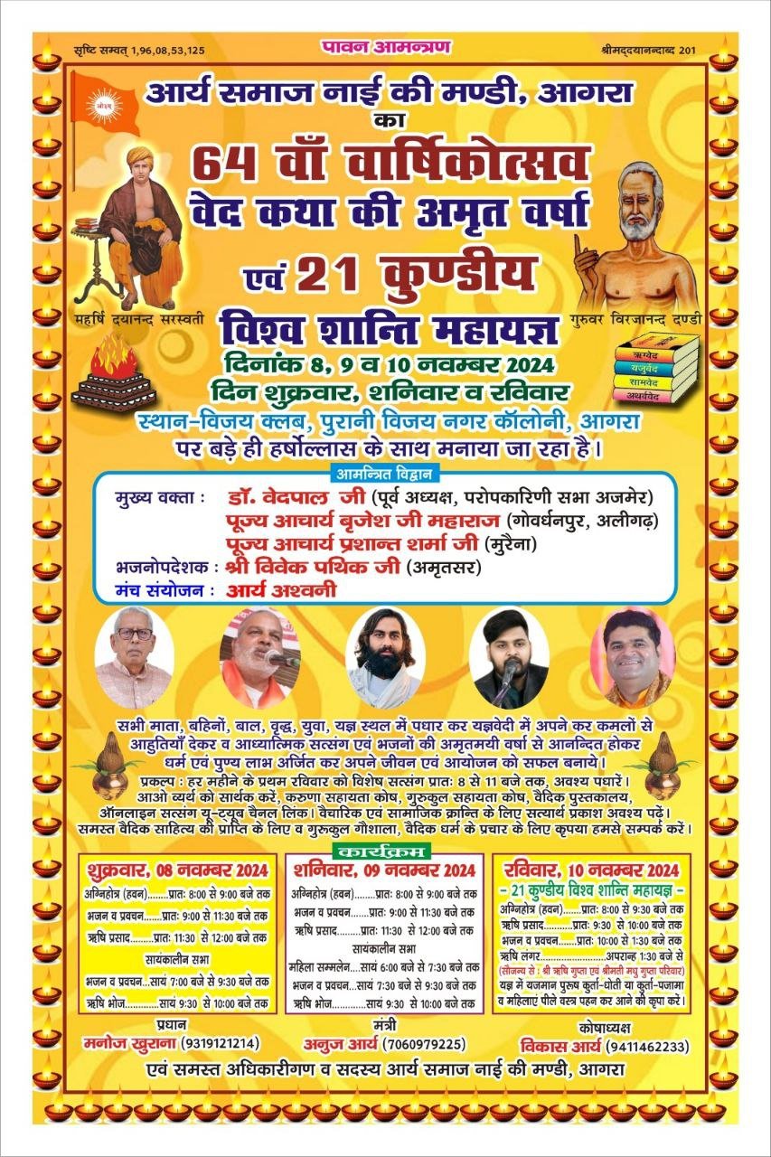 आर्य समाज नाई की मण्डी, आगरा का 64 वाँ वार्षिकोत्सव वेद कथा की अमृत वर्षा एवं 21 कुण्डीय विश्व शान्ति महायज्ञ