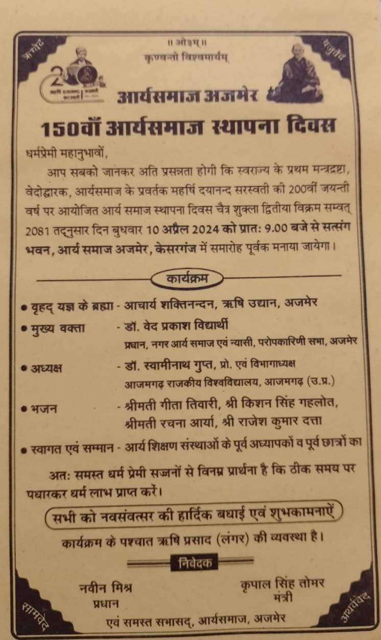 आप सबको जानकर अति प्रसन्नता होगी कि स्वराज्य के प्रथम मन्त्रद्रष्टा, वेदोद्धारक, आर्यसमाज के प्रवर्तक महर्षि दयानन्द सरस्वती की 200वीं जयन्ती वर्ष पर आयोजित आर्य समाज स्थापना दिवस चैत्र शुक्ला द्वितीया विक्रम सम्वत् 2081 तद्नुसार दिन बुधवार 10 अप्रैल 2024 को प्रातः 9.00 बजे से सत्संग भवन, आर्य समाज अजमेर, केसरगंज में समारोह पूर्वक मनाया जायेगा।