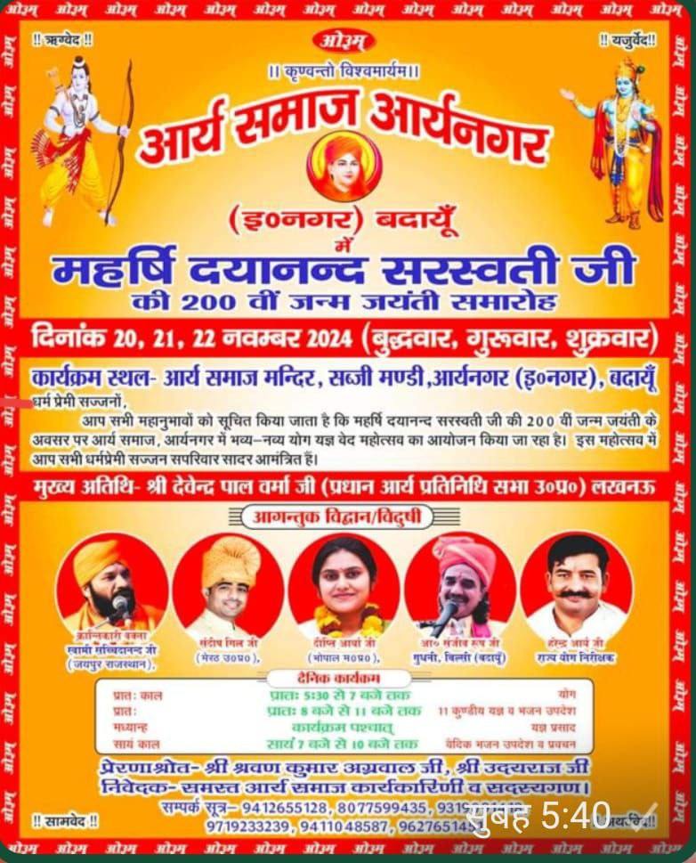 आप सभी महानुभावों को सूचित किया जाता है कि महर्षि दयानन्द सरस्वती जी की 200 वीं जन्म जयंती के अवसर पर आर्य समाज, आर्यनगर में भव्य नव्य योग यज्ञ वेद महोत्सव का आयोजन किया जा रहा है। इस महोत्सव में आप सभी धर्मप्रेमी सज्जन सपरिवार सादर आमंत्रित हैं।