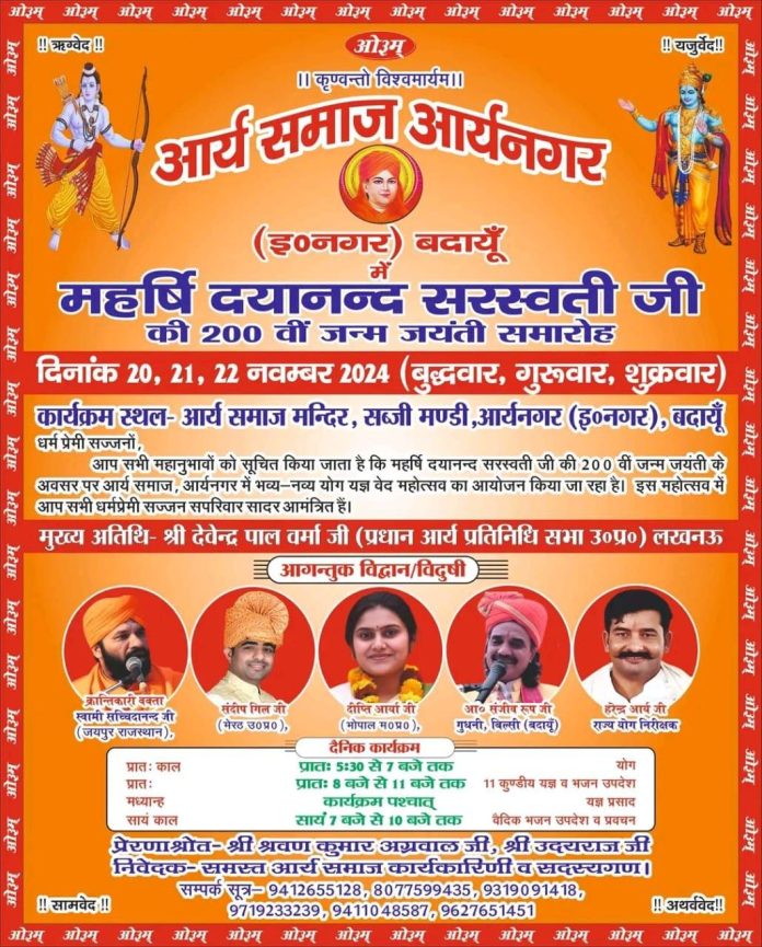 आप सभी महानुभावों को सूचित किया जाता है कि महर्षि दयानन्द सरस्वती जी की 200 वीं जन्म जयंती के अवसर पर आर्य समाज, आर्यनगर में भव्य-नव्य योग यज्ञ वेद महोत्सव का आयोजन किया जा रहा है। इस महोत्सव में आप सभी धर्मप्रेमी सज्जन सपरिवार सादर आमंत्रित हैं।