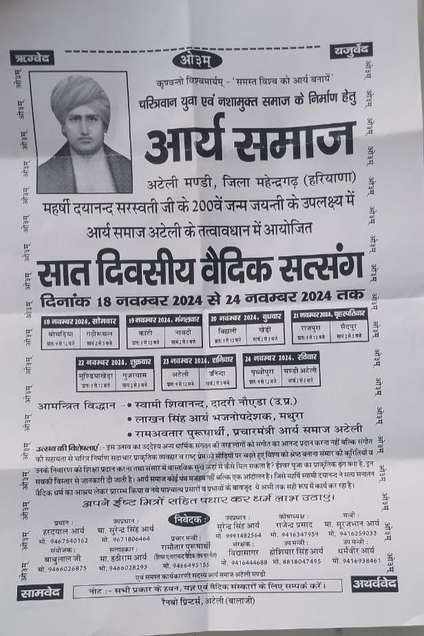 आर्य समाज अटेली मण्डी, जिला महेन्द्रगढ़ (हरियाणा) महर्षी दयानन्द सरस्वती जी के 200 वें जन्म जयन्ती के उपलक्ष्य में