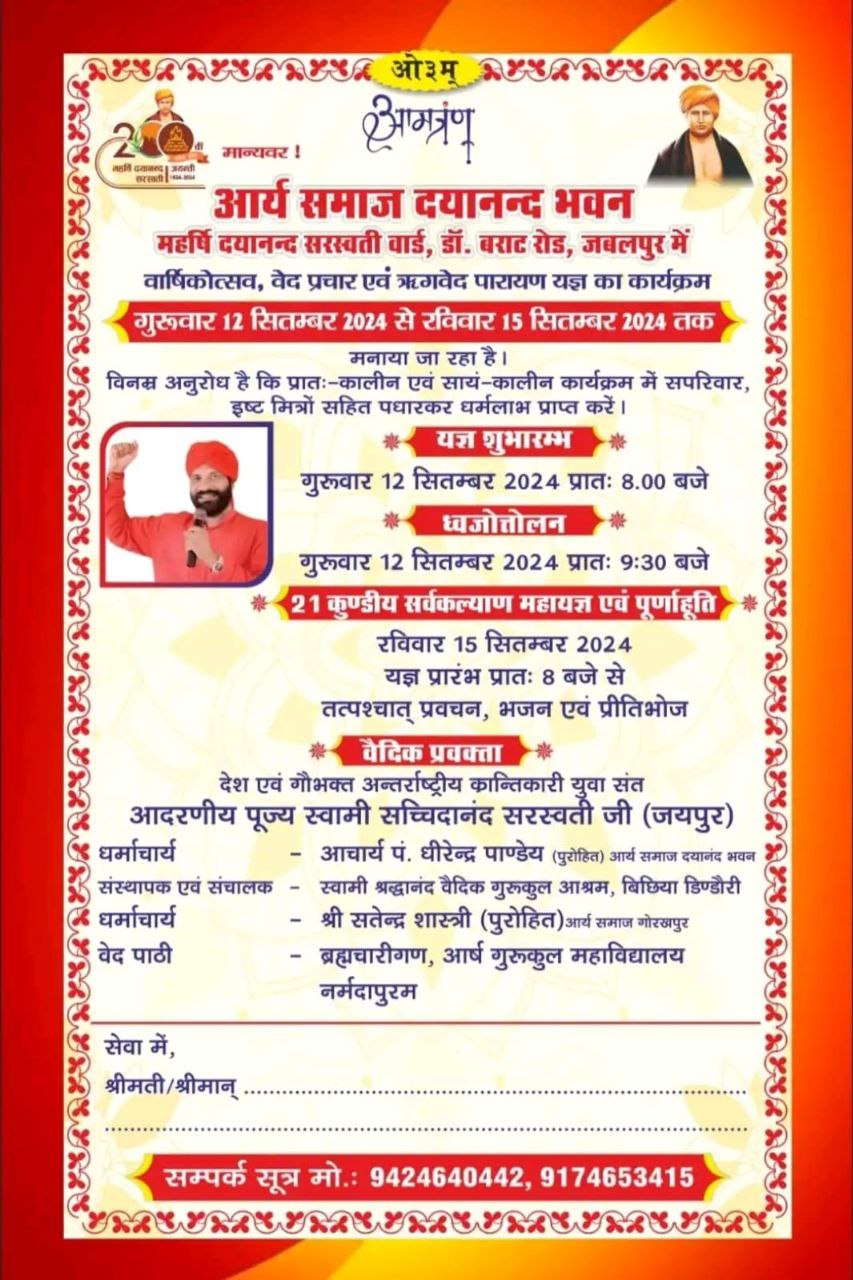 गुरुवार दिनांक 12 सितम्बर 2024 से रविवार 15 सितम्बर 2024 तक चार दिवसीय वृहद आयोजन आद. स्वामी सच्चिदानंद सरस्वती जी (रिवालाधाम कोटपुतली जयपुर)एवं आचार्य धीरेन्द्र पाण्डेय(पुरोहित- आर्य समाज जबलपुर)के आध्यात्मिक मार्ग दर्शन में सम्पन्न होगा। सभी महानुभावों से आग्रह है कि उपस्थित होकर यज्ञ एवं प्रवचन का लाभ प्राप्त करें।