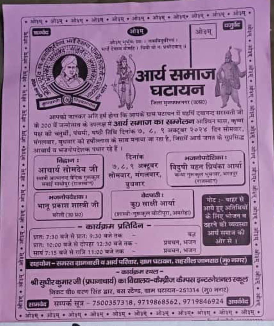 आपको जानकर अति हर्ष होगा कि आपके ग्राम घटायन में महर्षि दयानन्द सरस्वती जी के 200 वें जन्मोत्सव के उपलक्ष में आर्य समाज का सम्मेलन आश्विन मास, कृष्ण पक्ष की चतुर्थी, पंचमी, षष्ठी तिथि दिनांक ७, ८, ९ अक्टूबर २०२४ दिन सोमवार, मंगलवार, बुधवार को हल्लास के साथ मनाया जा रहा है, जिसमें आर्य जगत के सुप्रसिद्ध आचार्य व भजनोपदेशक पधार रहे हैं।