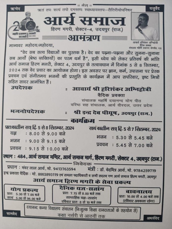 “वेद सब सत्य विद्याओं का पुस्तक है। वेद का पढ़ना-पढ़ाना और सुनना-सुनाना सब आर्यों (श्रेष्ठ व्यक्तियों) का परम धर्म है”, इसी ध्येय को लेकर प्रतिवर्ष की भांति आर्य समाज हिरण मगरी, सेक्टर 4, उदयपुर के तत्वावधान में दिनांक 5 से 8 सितम्बर, 2024 तक वेद प्रचार का आयोजन होगा। इस अवसर पर ज्ञान, कर्म, उपासना पर प्रेरक प्रवचन एवं संगीतमय भजनों की प्रस्तुति के कार्यक्रम में आप सपरिवार, इष्ट मित्रों सहित सादर आमंत्रित हैं।