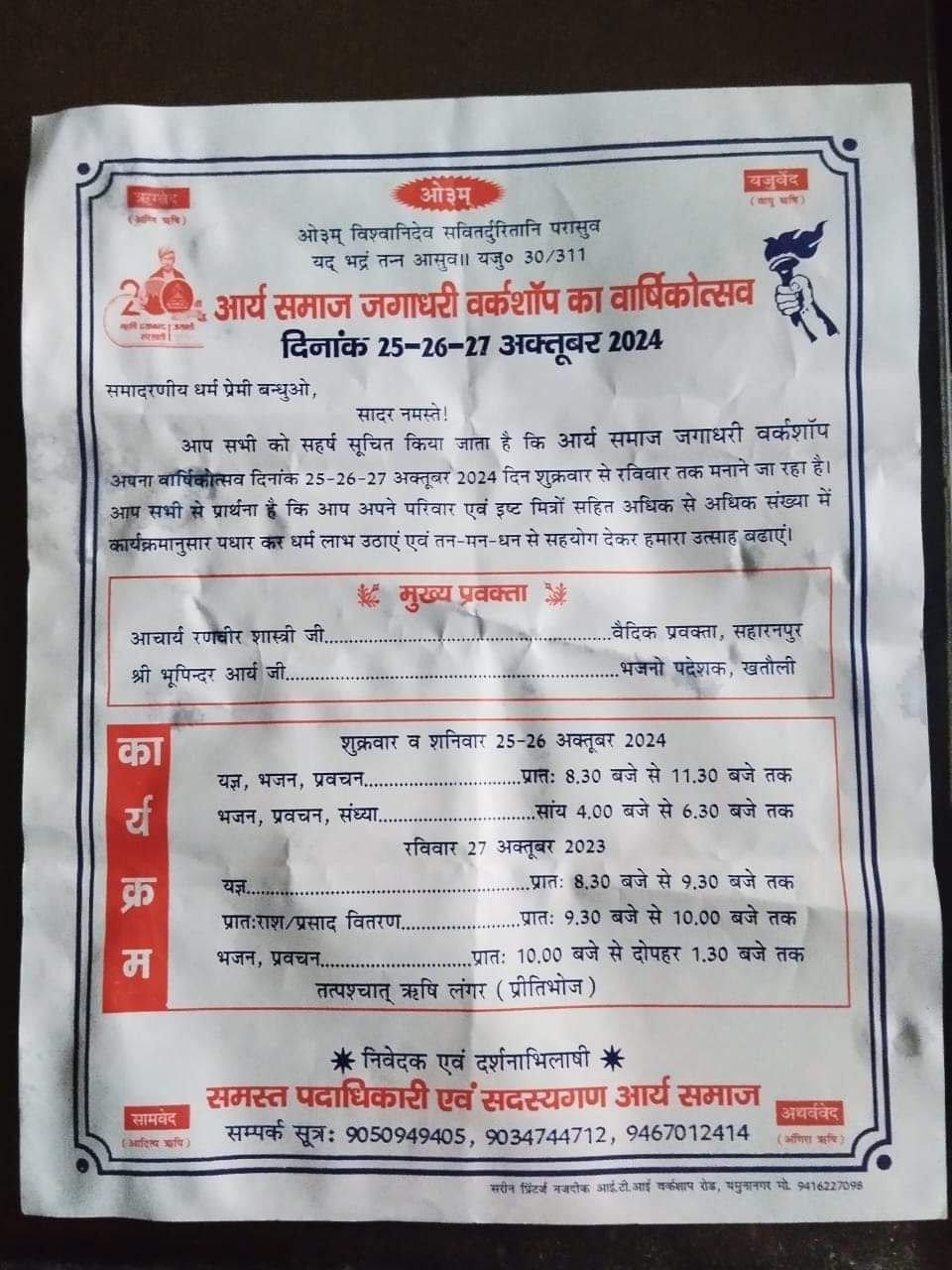 आप सभी को सहर्ष सूचित किया जाता है कि आर्य समाज जगाधरी वर्कशॉप अपना वार्षिकोत्सव दिनांक 25-26-27 अक्तूबर 2024 दिन शुक्रवार से रविवार तक मनाने जा रहा है। आप सभी से प्रार्थना है कि आप अपने परिवार एवं इष्ट मित्रों सहित अधिक से अधिक संख्या में कार्यक्रमानुसार पधार कर धर्म लाभ उठाएं एवं तन-मन-धन से सहयोग देकर हमारा उत्साह बढाएं।