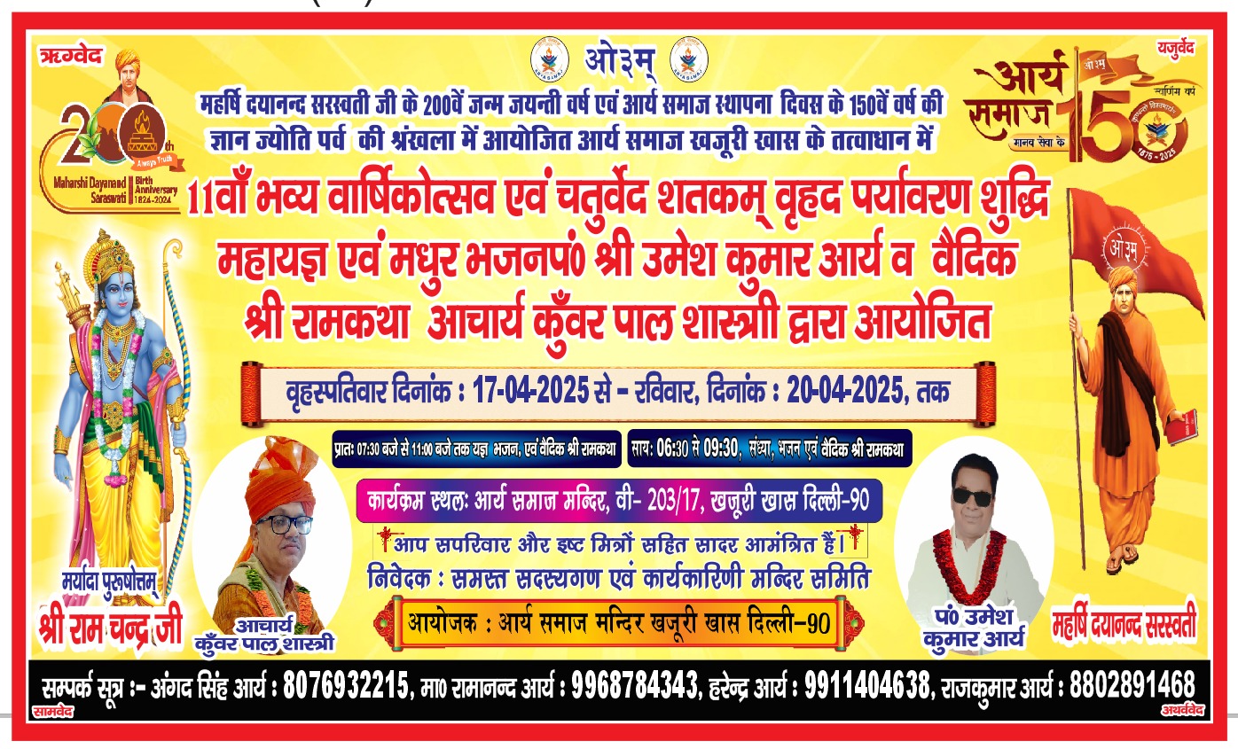 आर्य समाज मन्दिर, खजूरी खास दिल्ली-90 में एक ऐतिहासिक, आध्यात्मिक एवं प्रेरणादायक आयोजन का आयोजन किया गया है, जिसमें महर्षि दयानन्द सरस्वती जी के 200वें जन्म वर्ष और आर्य समाज की स्थापना के 150 वर्ष पूर्ण होने के उपलक्ष्य में “न्वर्णिम वर्ष – मानव सेवा के” अंतर्गत 11वाँ भव्य वार्षिकोत्सव तथा चतुर्वेद शतकम् वृहद पर्यावरण शुद्धि महायज्ञ और वैदिक श्री रामकथा का आयोजन किया जा रहा है।