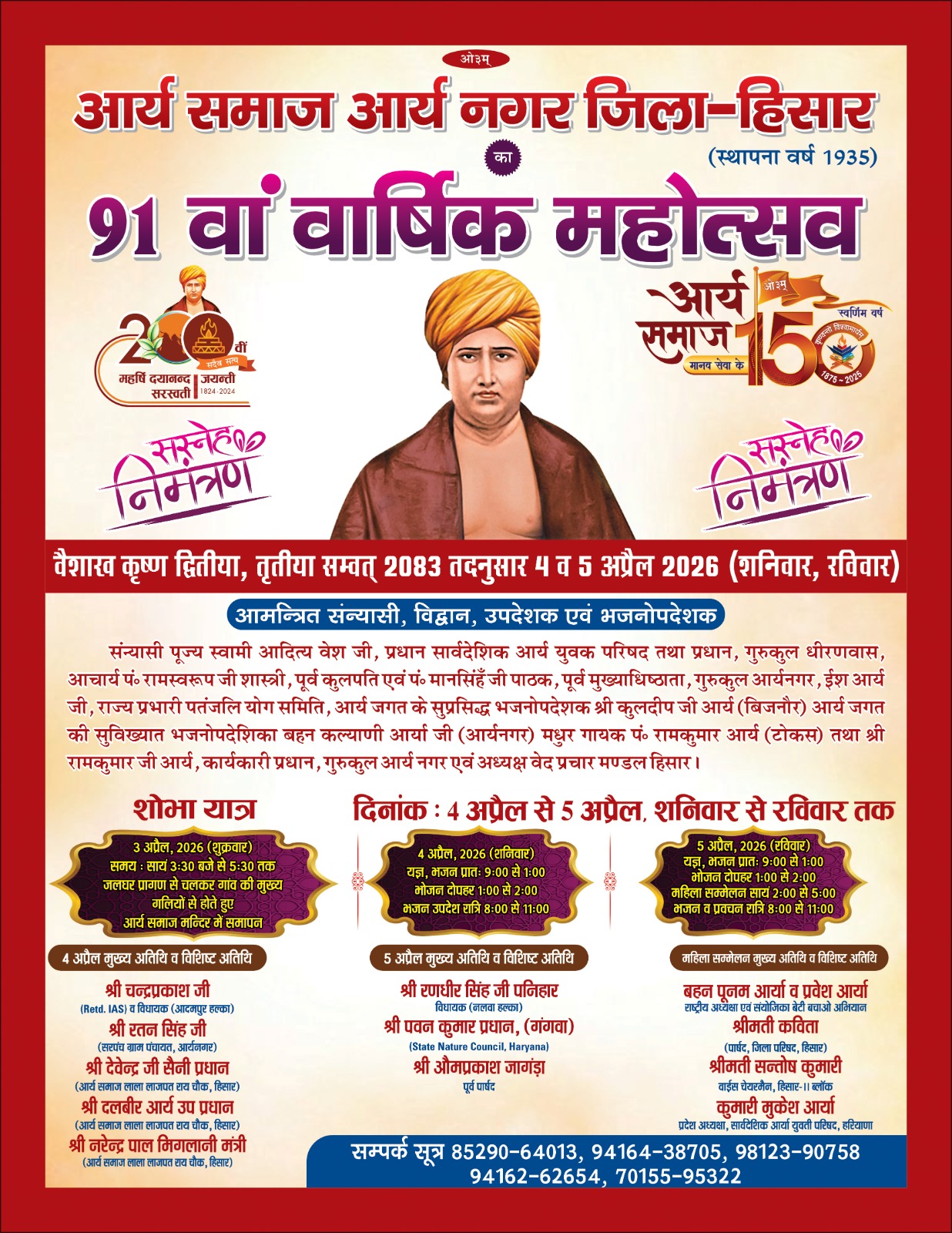 आर्य समाज का यह 91वाँ वार्षिक महोत्सव हमें वैदिक संस्कृति, सत्य, धर्म और समाज सेवा के मार्ग पर चलने की प्रेरणा देता है। आइए, हम सभी इस पावन आयोजन का हिस्सा बनें और महर्षि दयानंद सरस्वती जी के आदर्शों को जन-जन तक पहुँचाने में अपना योगदान दें।