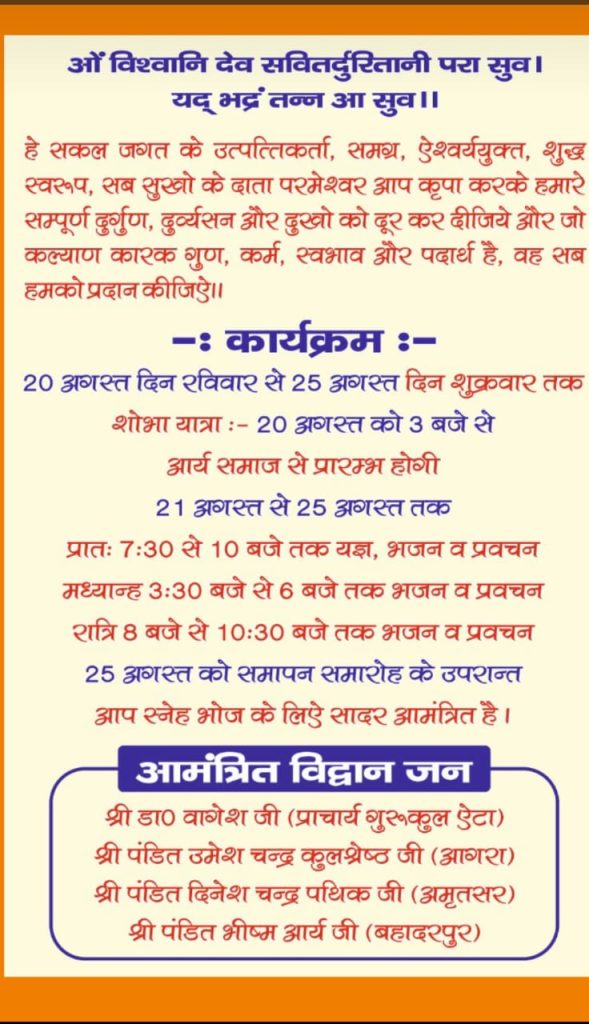 कृण्वन्तो विश्वमार्यम् पूरा विश्व आर्य (श्रेष्ठ) बने आर्य समाज किरतपुर के 77 वे वार्षिक उत्सव समारोह व महर्षि दयानन्द सरस्वती जी के 200 वीं जयन्ती वर्ष के उपलक्ष्य में निमन्त्रण पत्र –