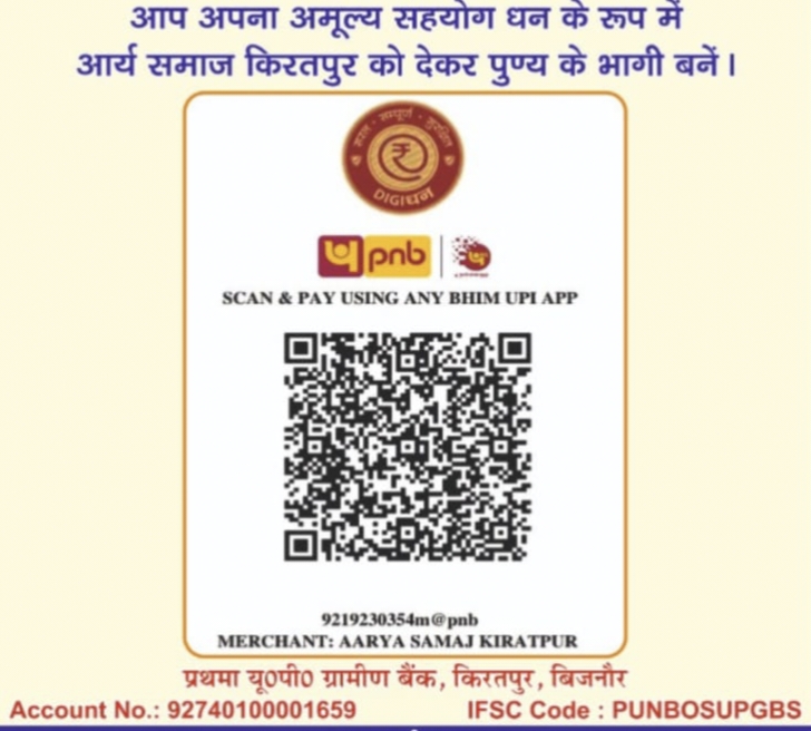 आप अपना अमूल्य सहयोग धन के रूप में आर्य समाज किरतपुर को देकर पुण्य के भागी बनें।