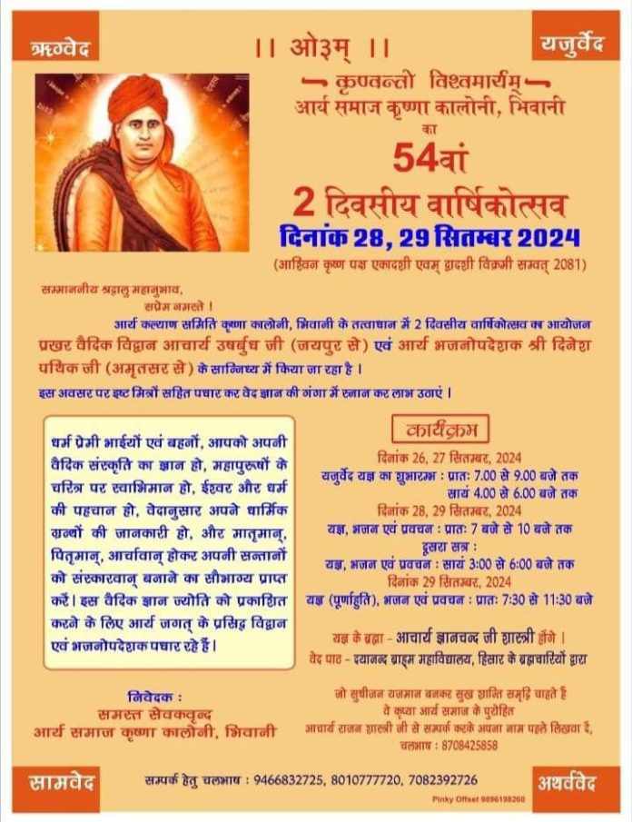 आर्य कल्याण समिति कृष्णा कालोनी, भिवानी के तत्वाधान में 2 दिवसीय वार्षिकोत्सव का आयोजन प्रखर वैदिक विद्वान आचार्य उषर्बुध जी (जयपुर से) एवं आर्य भजनोपदेशक श्री दिनेश पथिक जी (अमृतसर से) के सान्निध्य में किया जा रहा है। इस अवसर पर इष्ट मित्रों सहित पधार कर वेद ज्ञान की गंगा में स्नान कर लाभ उठाएं ।