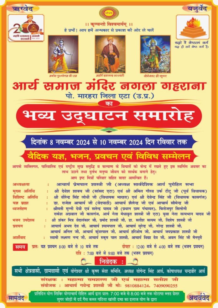 भजन उपदेशक – राकेश अग्रवाल जी कासगंज, आर्य नेता मेधावृत शास्त्री जी एटा) युवा नेता सत्यभान यादव जी श्री शंकर मित्र वेदालंकार जी, प्रमोद शास्त्री जी,