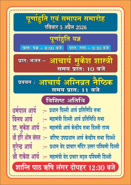 आर्य समाज मंदिर, रानी बाग द्वारा सभी श्रद्धालुओं को सपरिवार एवं मित्रों सहित इस पावन और दुर्लभ अवसर में सम्मिलित होने के लिए सादर आमंत्रित किया गया है।